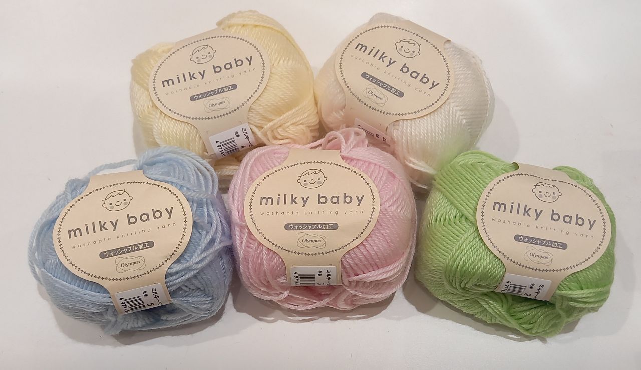 ミルキーベビーにところどころ差し色の入った可愛いポップな毛糸です。