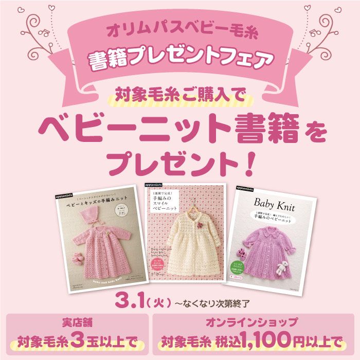 また現在、「オリムパスベビー毛糸 書籍プレゼントフェア」を開催中です!