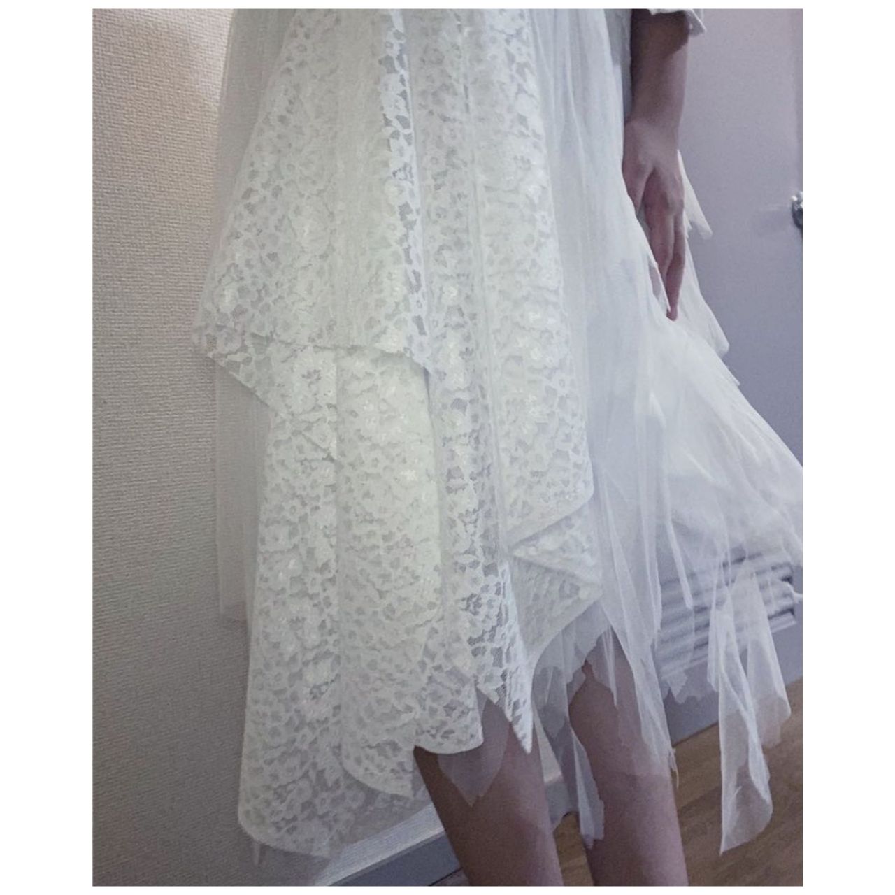 チュール×レースの素材感、透け感を活かした技アリ!なスカートですね♪全身ワントーンのコーディネートが素敵です!