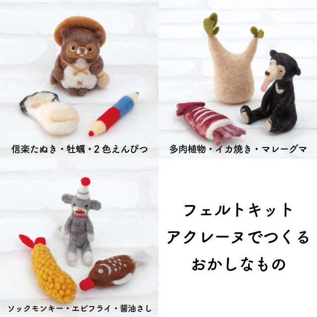 右上:フェルトキット アクレーヌでつくるおかしなもの(H441-587) 多肉植物・イカ焼き・マレーグマ