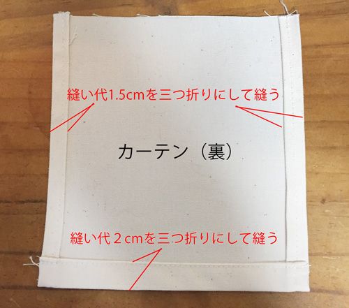 生地を17cmの正方形にカットし、画像のように端を三つ折りにして縫います。
