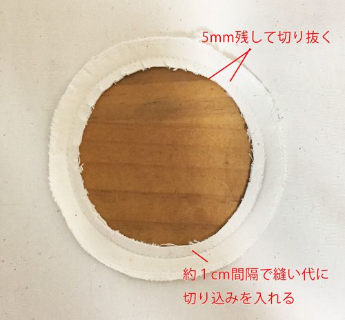 3)端を5mm残して中心から円く切り抜き、5mm幅の縫い代に切り込みを入れます。