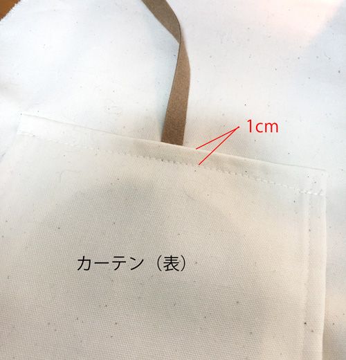 6)SGスエードを幅1cm×長さ46cmにカットし、カーテンと一緒にぬいつけます。