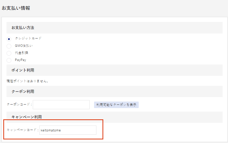 ご注文時のキャンペーンコード欄にこちら keitomatome をご入力ください。