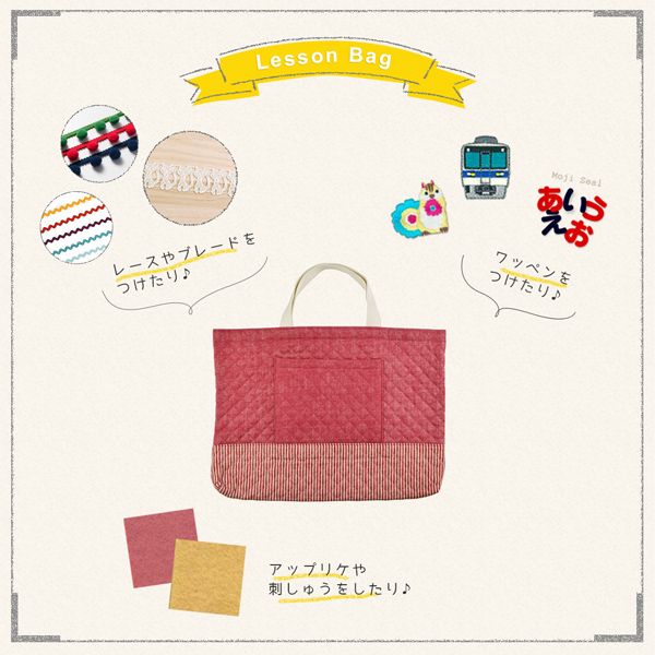 詳しく言いますと、「お子さんの為にオリジナルのバッグを作ってあげたいけどソーイングは苦手!」という方や、「一から作る時間は無いけれどお子さんのために手作りしてあげたい!」という方のためのアレンジ用レッスンバッグなのです!!