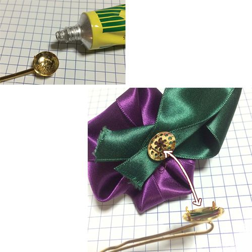 (4)ヘアピン土台部分にカネスチックを塗り、お椀パーツを土台にはめ込みます。