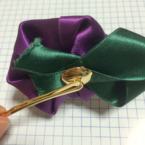 (3)位置を決めて、ヘアピンシャワーのお椀型の凸部分に、葉っぱ、巻バラの順で縫いとめます。