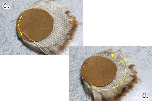 (3)縫い終わったら、ファー生地を土台のフェルト生地の円形位までキュと絞ります。