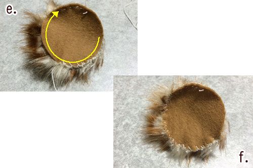 今度はフェルトとファー生地の端を、先程とは逆方向に一周するちょっと手前までくるくるまつっていきます。 (※画像e.黄色点線部)