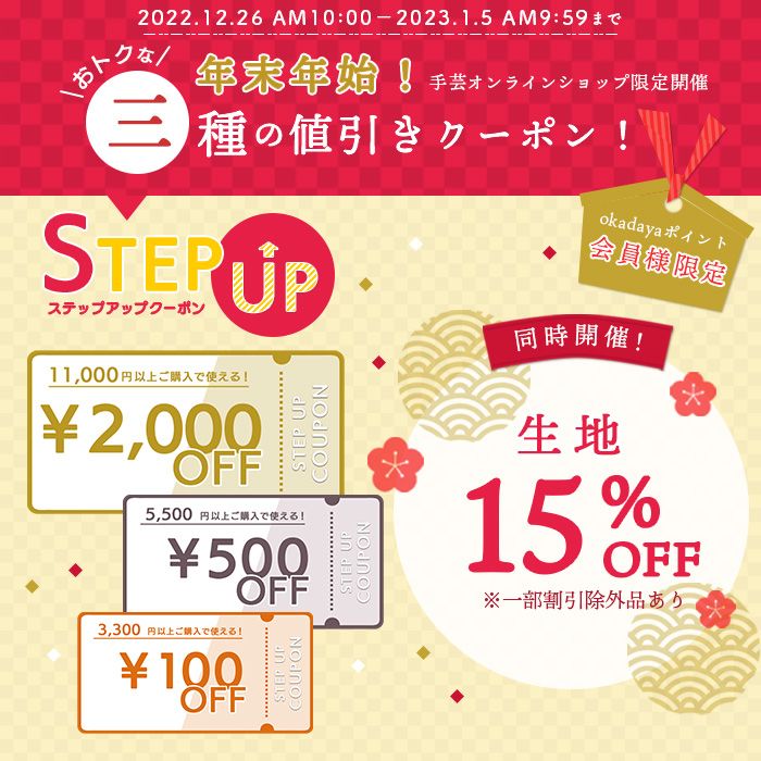 【12/26(月)~1/5(木)まで】オンラインショップ限定\最大2,000円OFF!ステップアップクーポン発行&生地15%OFFセール/