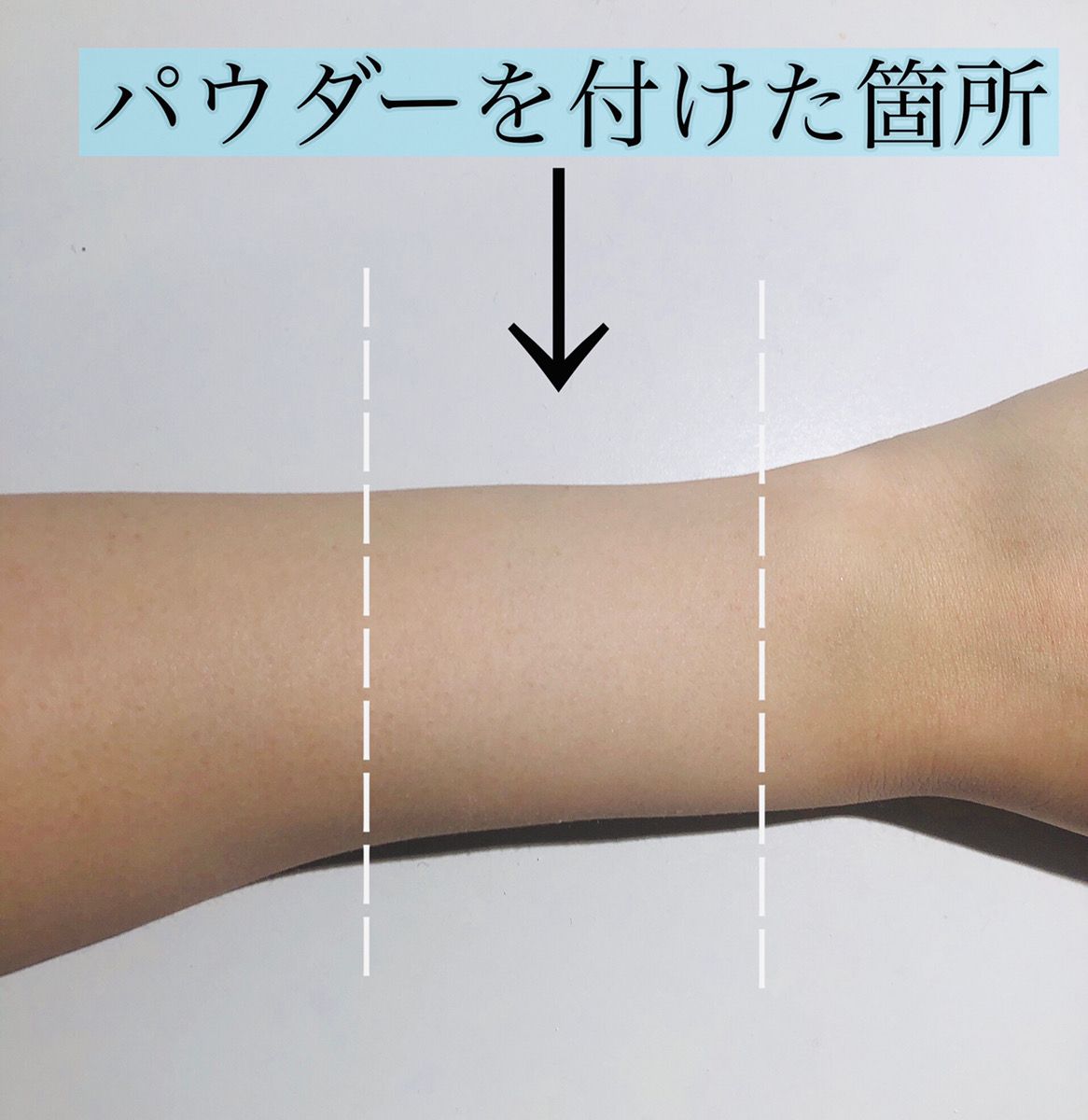 粉の見た目は白く、腕につけるとこんな感じです。