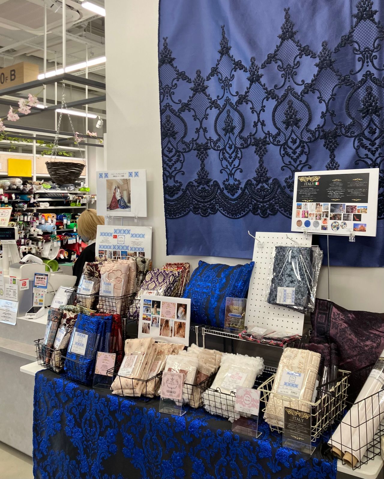 大判の生地をタペストリーのようにディスプレイ。レジカウンターと並ぶことで、そのダイナミックなスケール感も感じていただけますね。