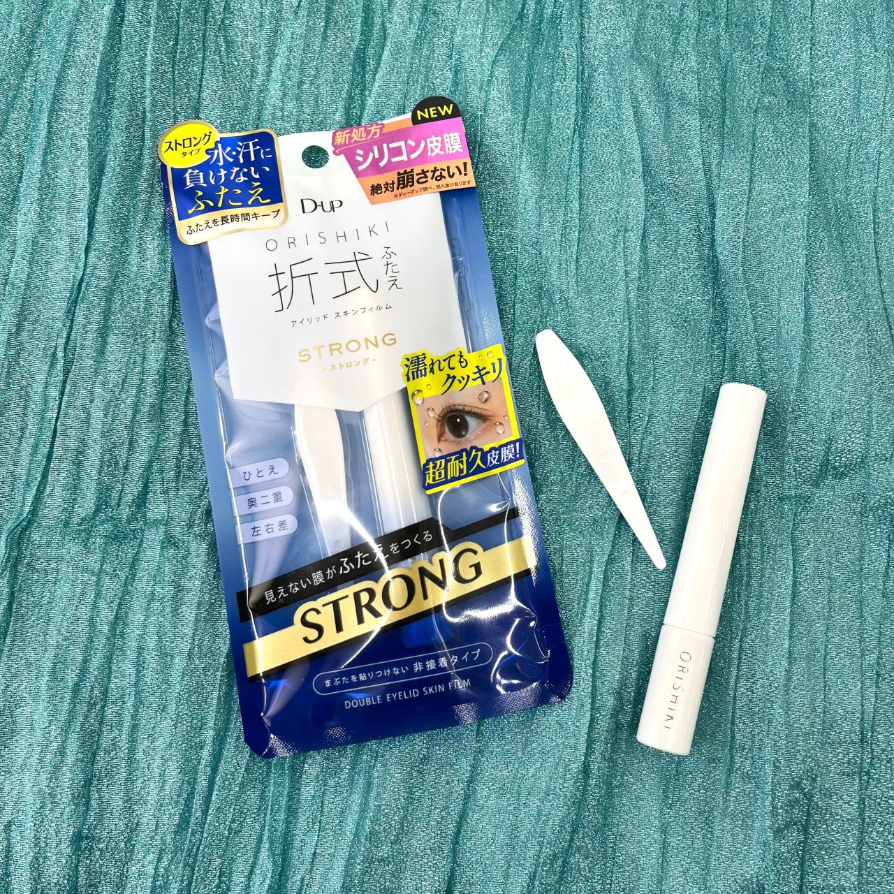 硬くハリのある皮膜を形成し、オリシキ史上最高の皮膜強度を実現!柔軟さと硬さを兼ね備え、まぶたを持ち上げてクッキリとしたふたえをつくります。