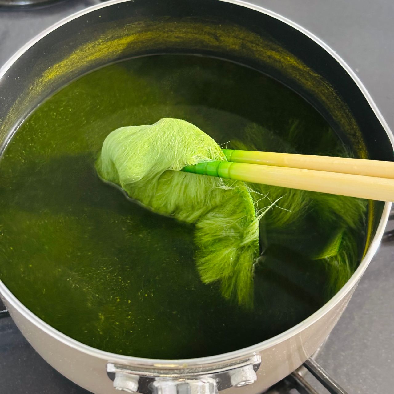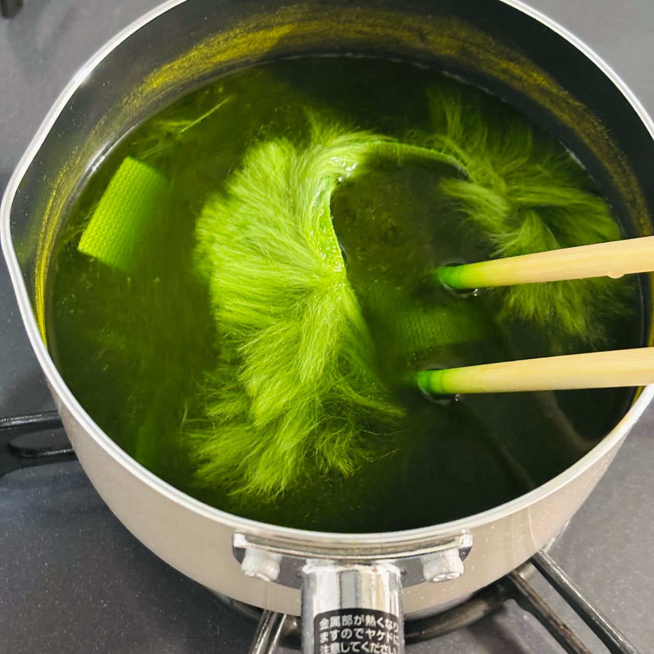 鍋に『染色液:水』を『1:20』の割合で入れて、火をかけ、70°〜80°にします