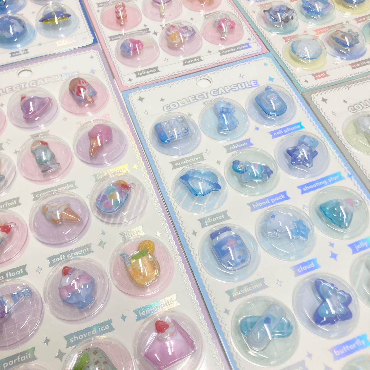 左はパープル&ブルーグリーン系のキレイなカラーで統一された、ゼリー携帯電話お薬‥?!などなど、ユニークな組み合わせの柄がセットになったシールです。