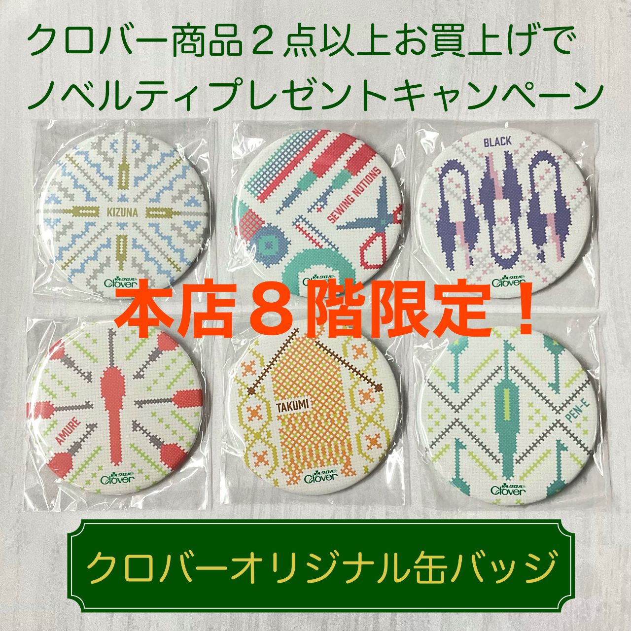 新宿本店8階の洋裁雑貨売場にあるソーイング用品限定ですが、期間中に8階でクロバー商品を2点以上お買上げでプレゼントいたします!!