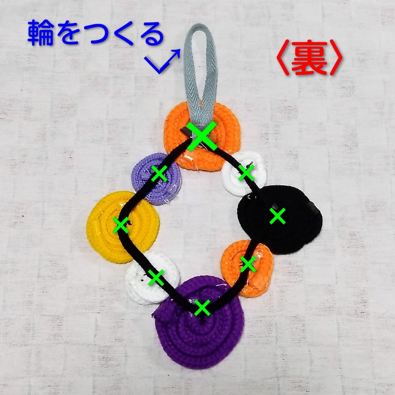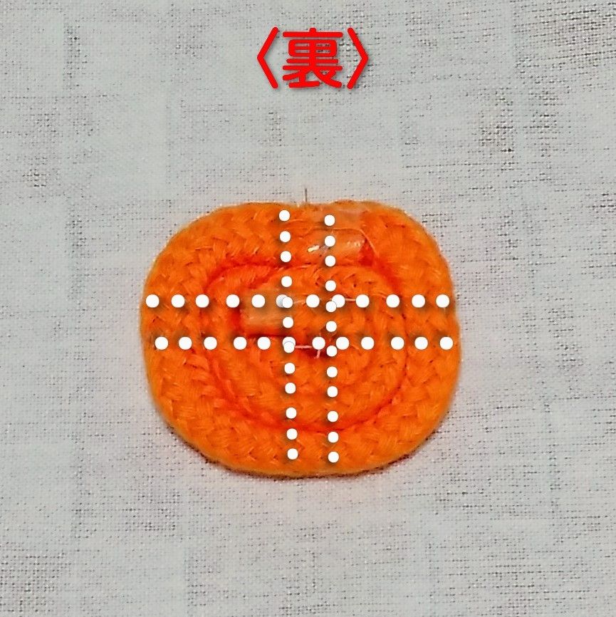 多めに残ったヒモ(今回は黒)を写真のように縫い付けて行き、