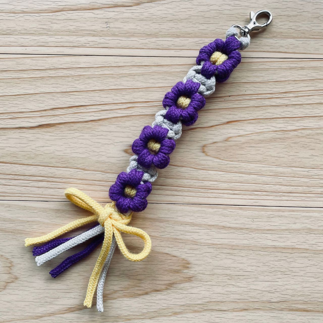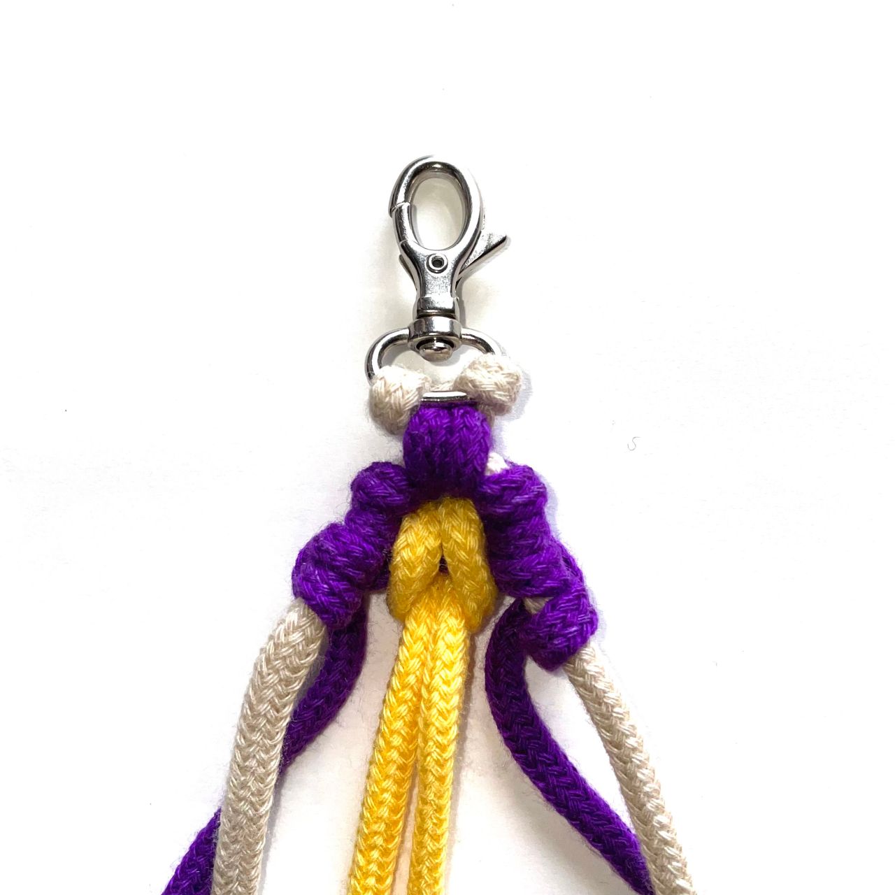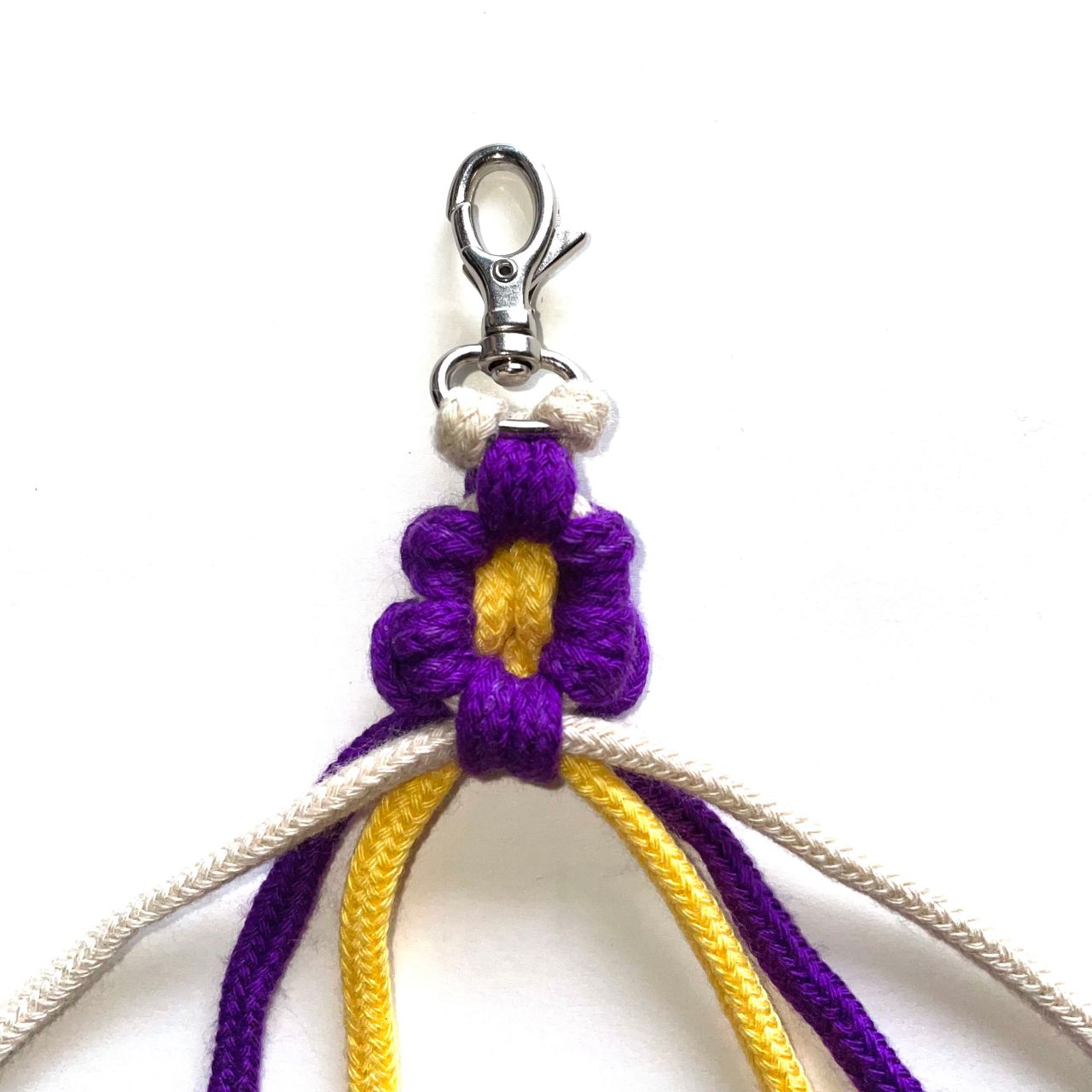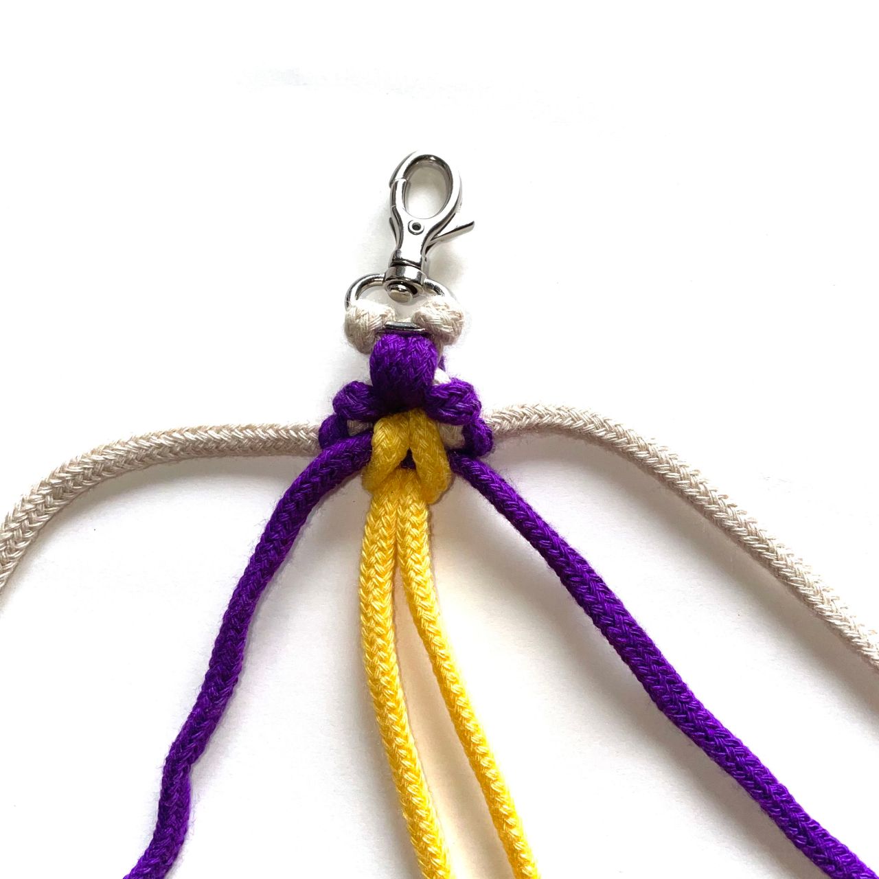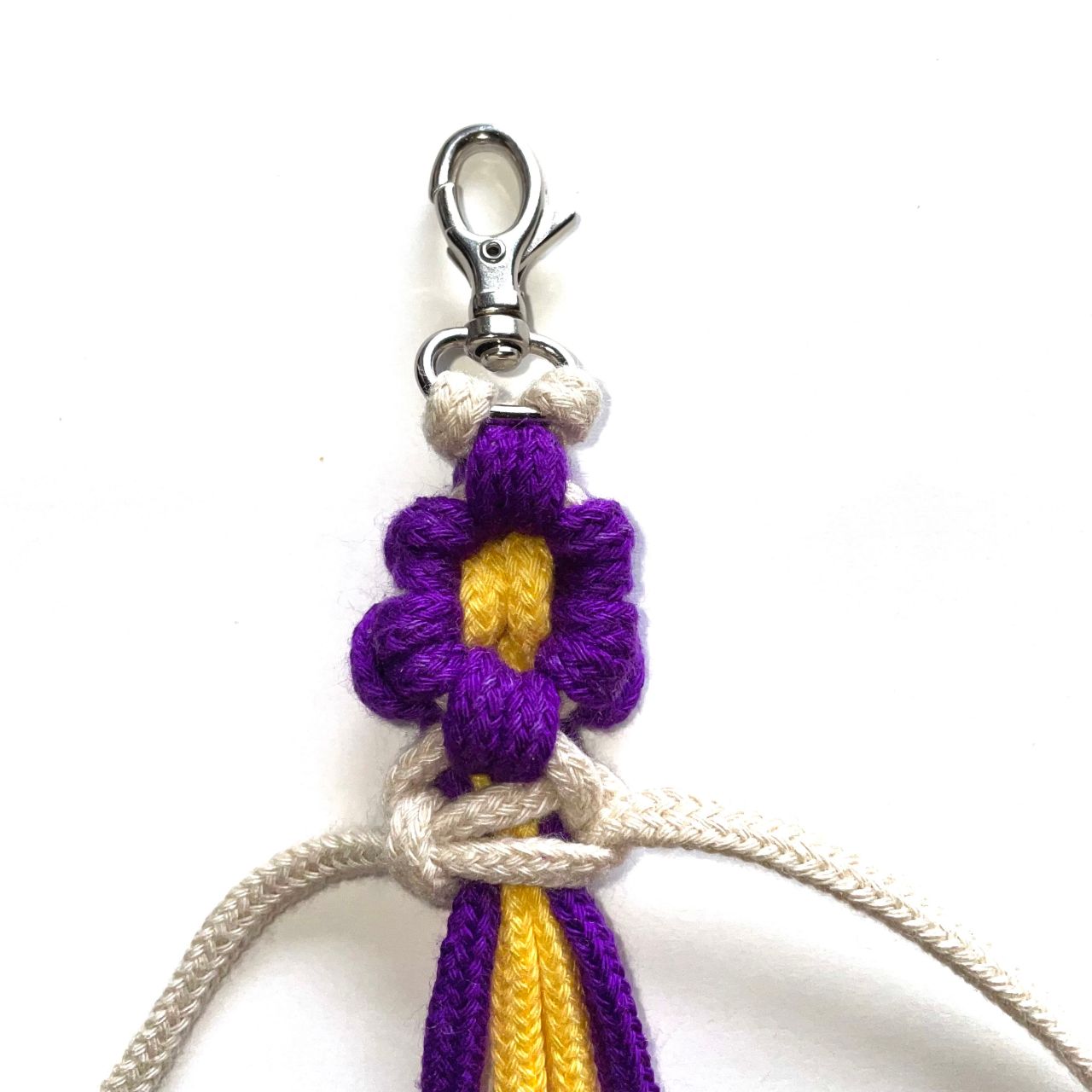 ⑩花の中心の紐で全ての紐をまとめて結び、蝶結びをして、紐先にほつれ止めのピケを塗れば完成です。