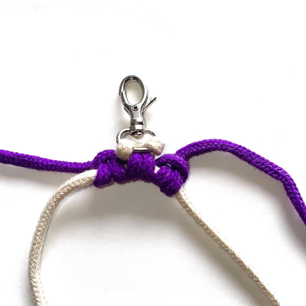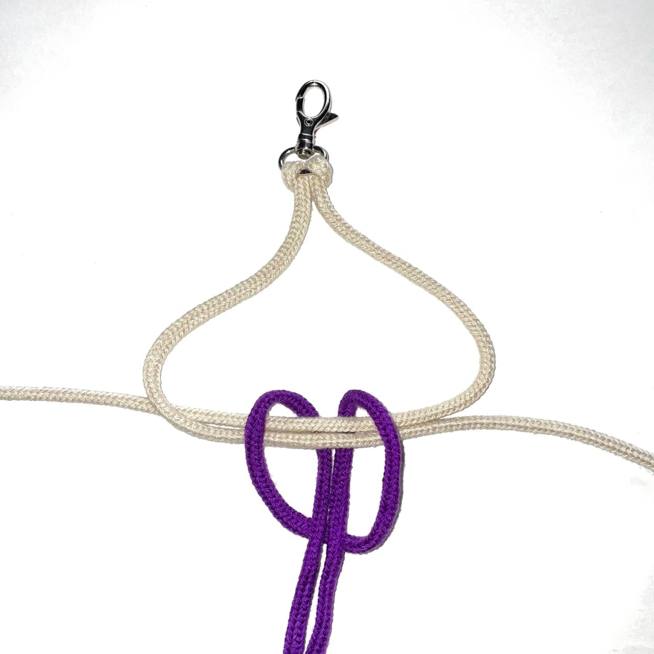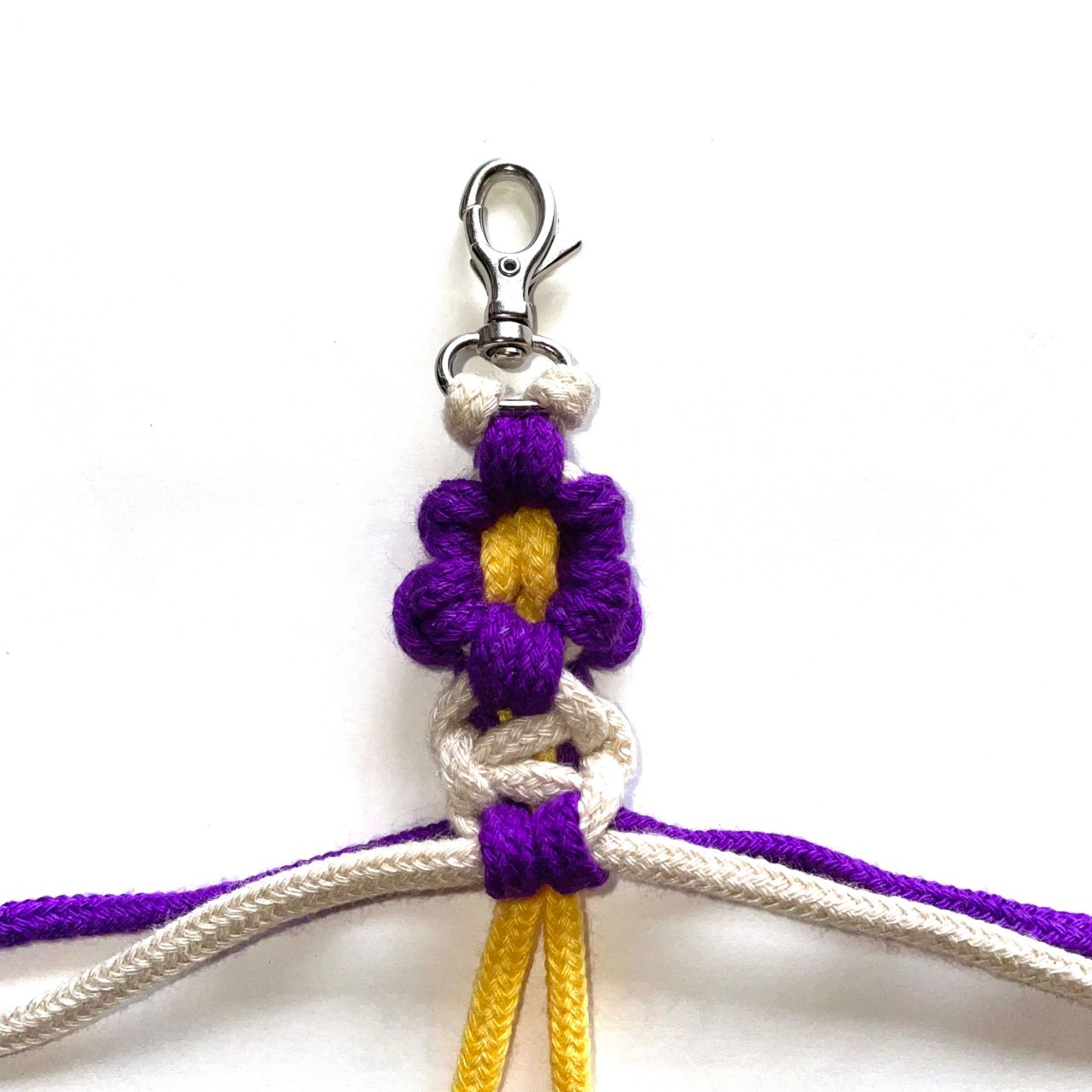 ⑥花びらの紐を1番下にして、軸の紐を交差させて花びらの紐を通して、下側の花びらを作ります。