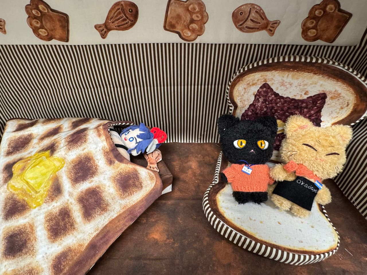 こんがりした焼き目が美味しそうな、猫型食パンをお布団に、食パンは椅子にしてみました♪
