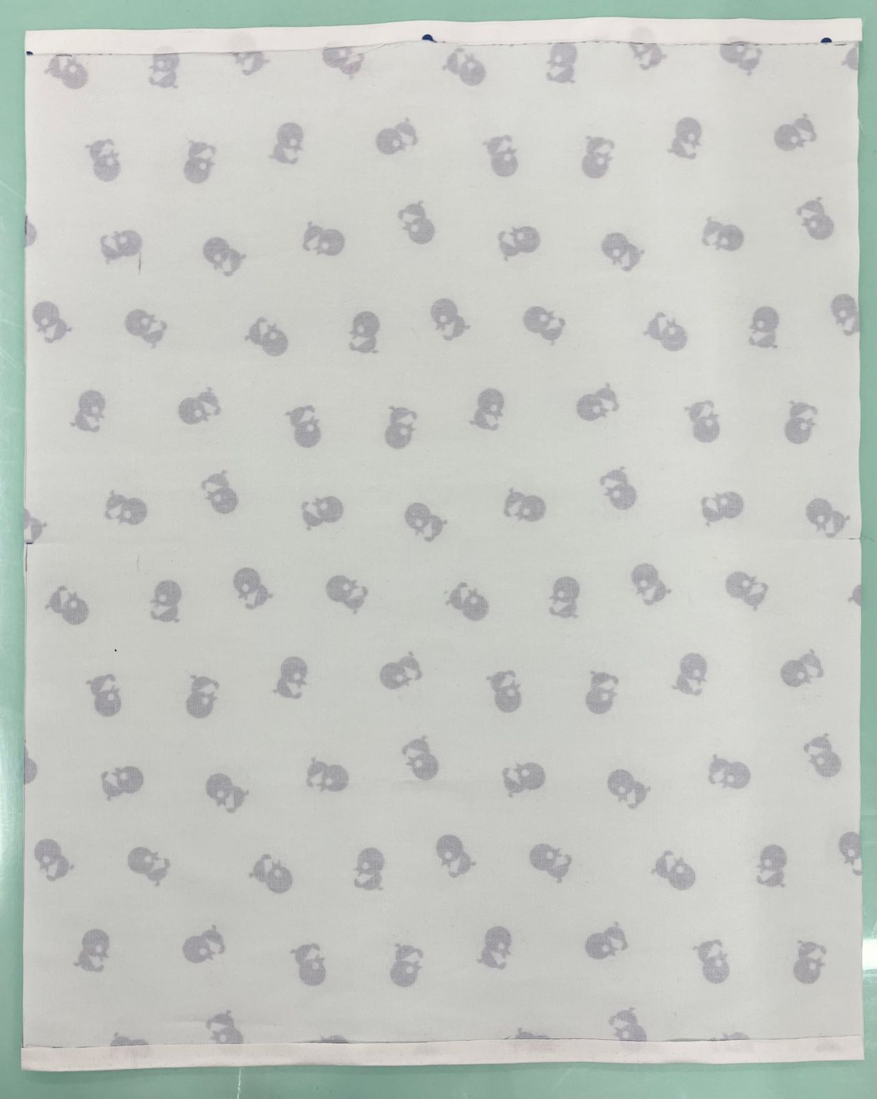 ①ティッシュの取り出し口になる方の布端を裏側に1cm折り、ボンドで貼って固定する