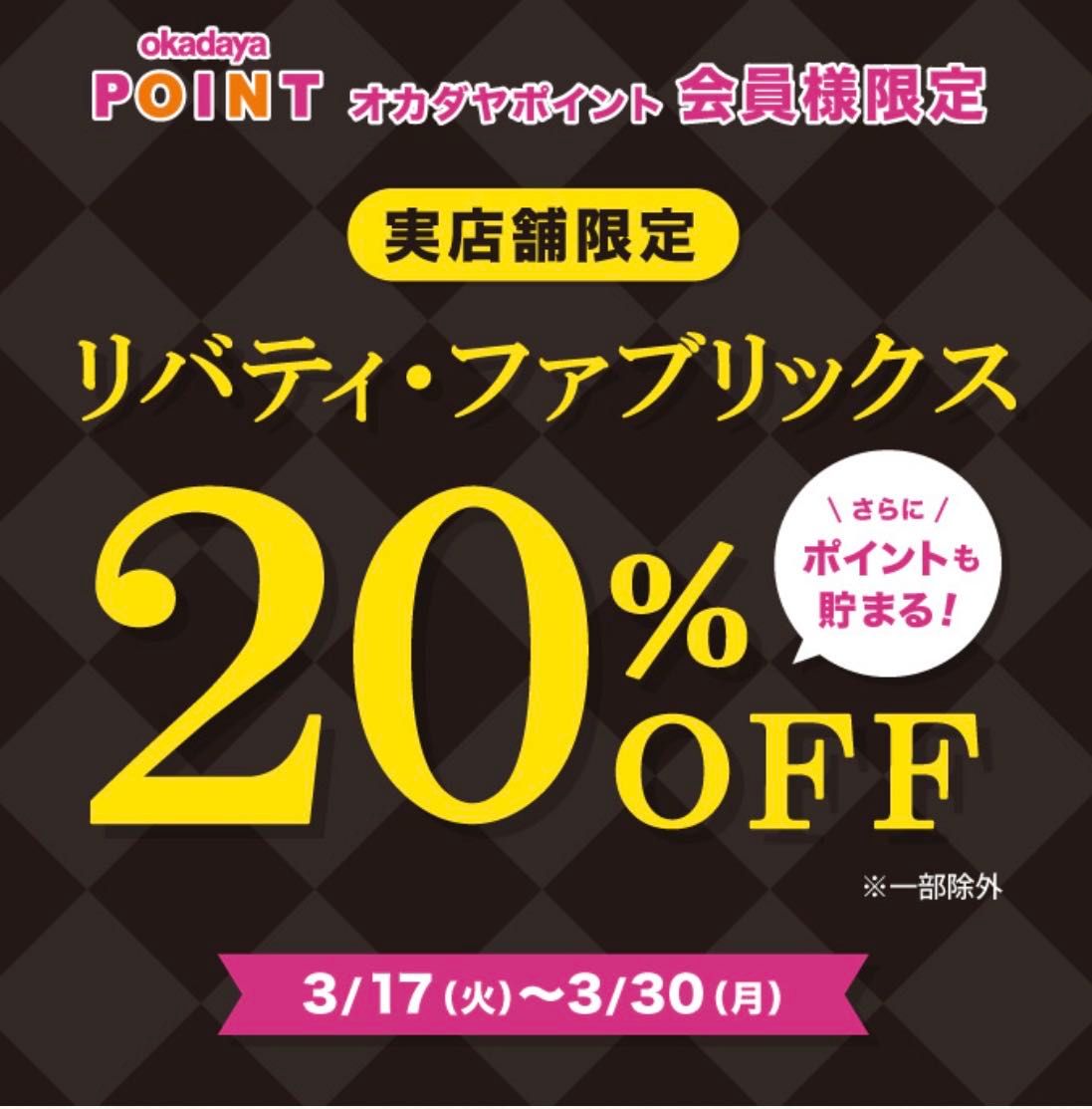 また、3/17〜3/30までオカダヤポイント会員様限定リバティ・ファブリックス20%OFFセール開催中です!