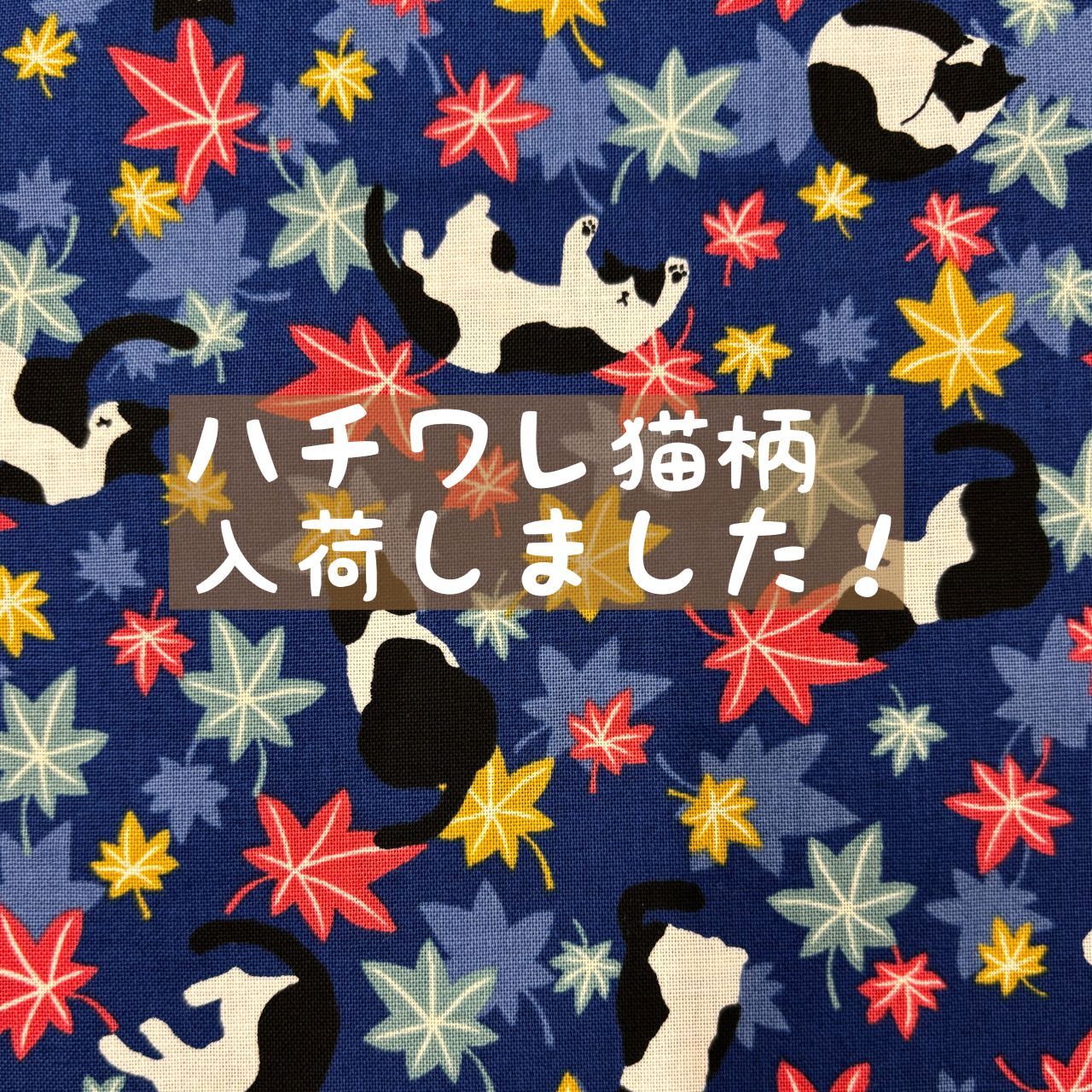 紅葉の中にハチワレの猫がゴロンゴロンしている愛らしい生地は全5色!