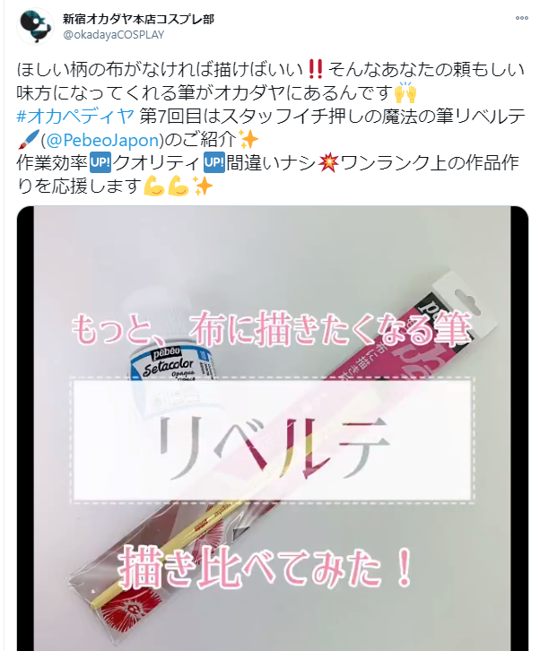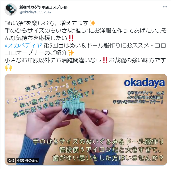 オカダヤ本店コスプレ部Twitterでは、コス部スタッフのおススメアイテムや店舗で撮影した動画、手作りアイテムのご紹介を♪
