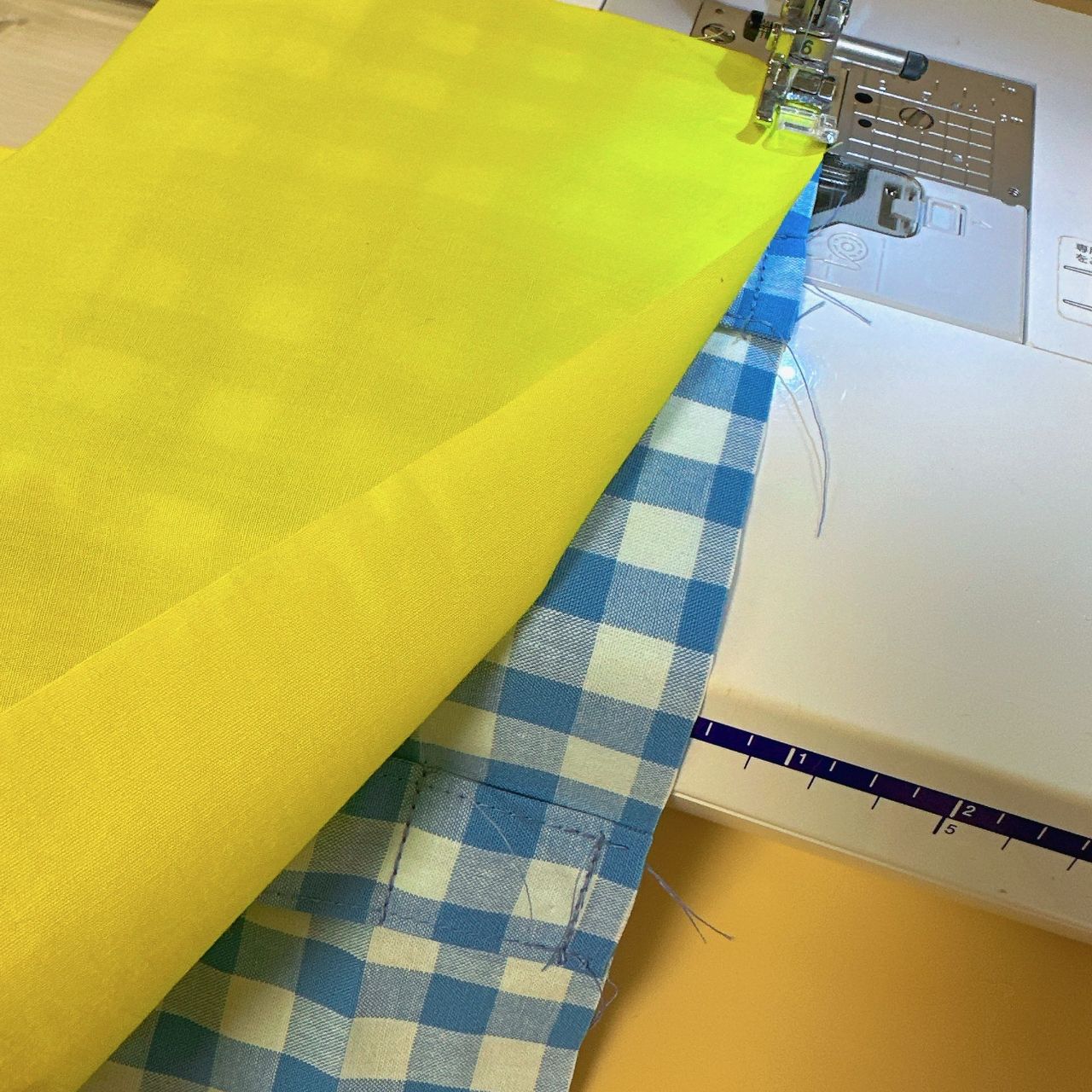 ④表布と裏布を中表に重ね縫い(縫い代1cm)、縫い代を裏布側に倒しアイロンをかけます。