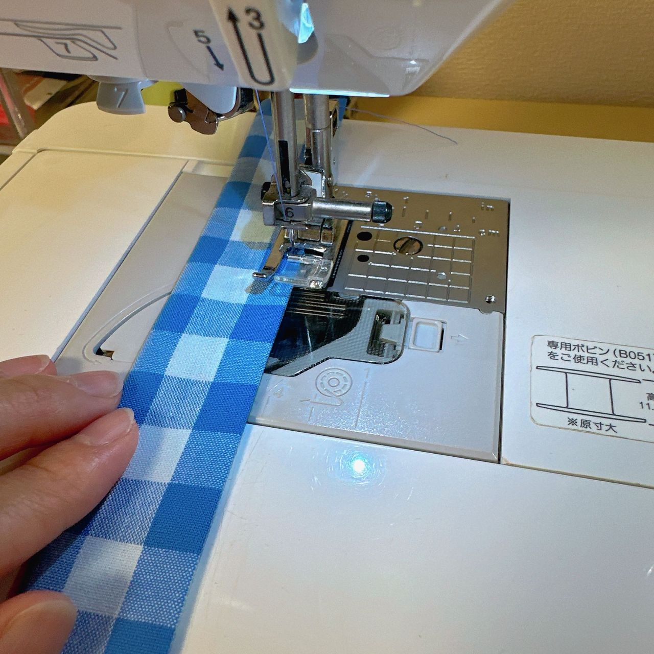 中心から5cmのところにそれぞれ持ち手を表布(表)の上に置き、上から0.5cmのところ、上から4cmのところにミシンをかけます。