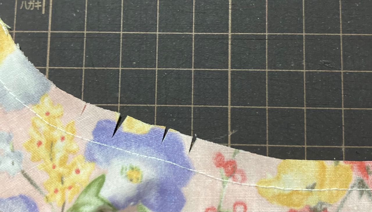 ④ カーブを縫い カーブの内側に縫い代1cmを残して切り落とし カーブ部分に切り込みをいれます