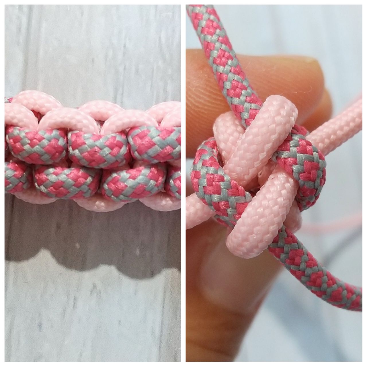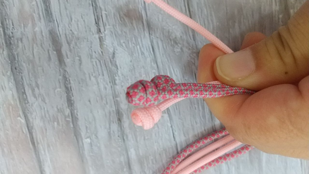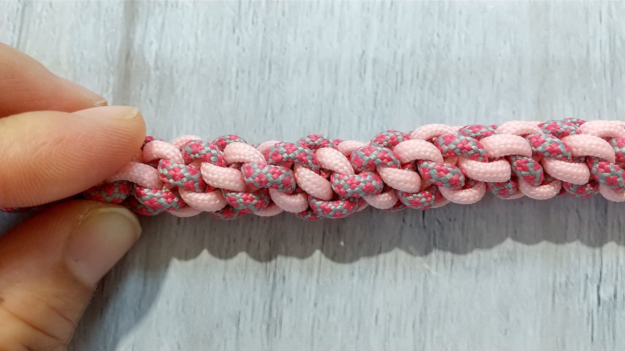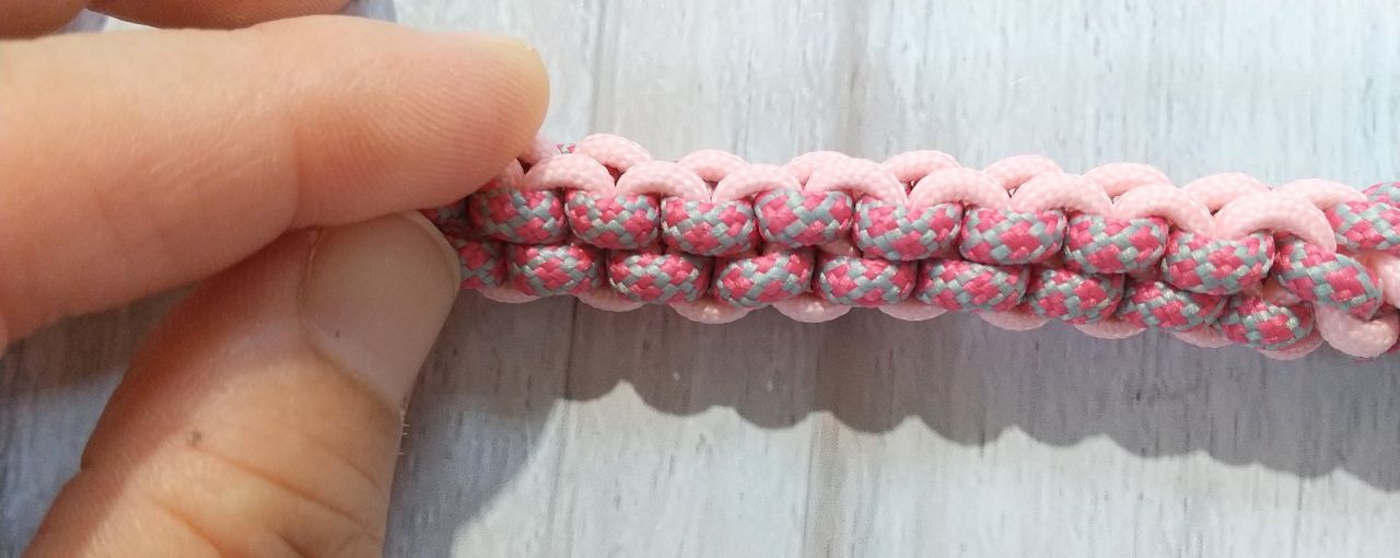 スナップフックにアウトドアコードを通して最初は「角四つだたみ」で編みます
