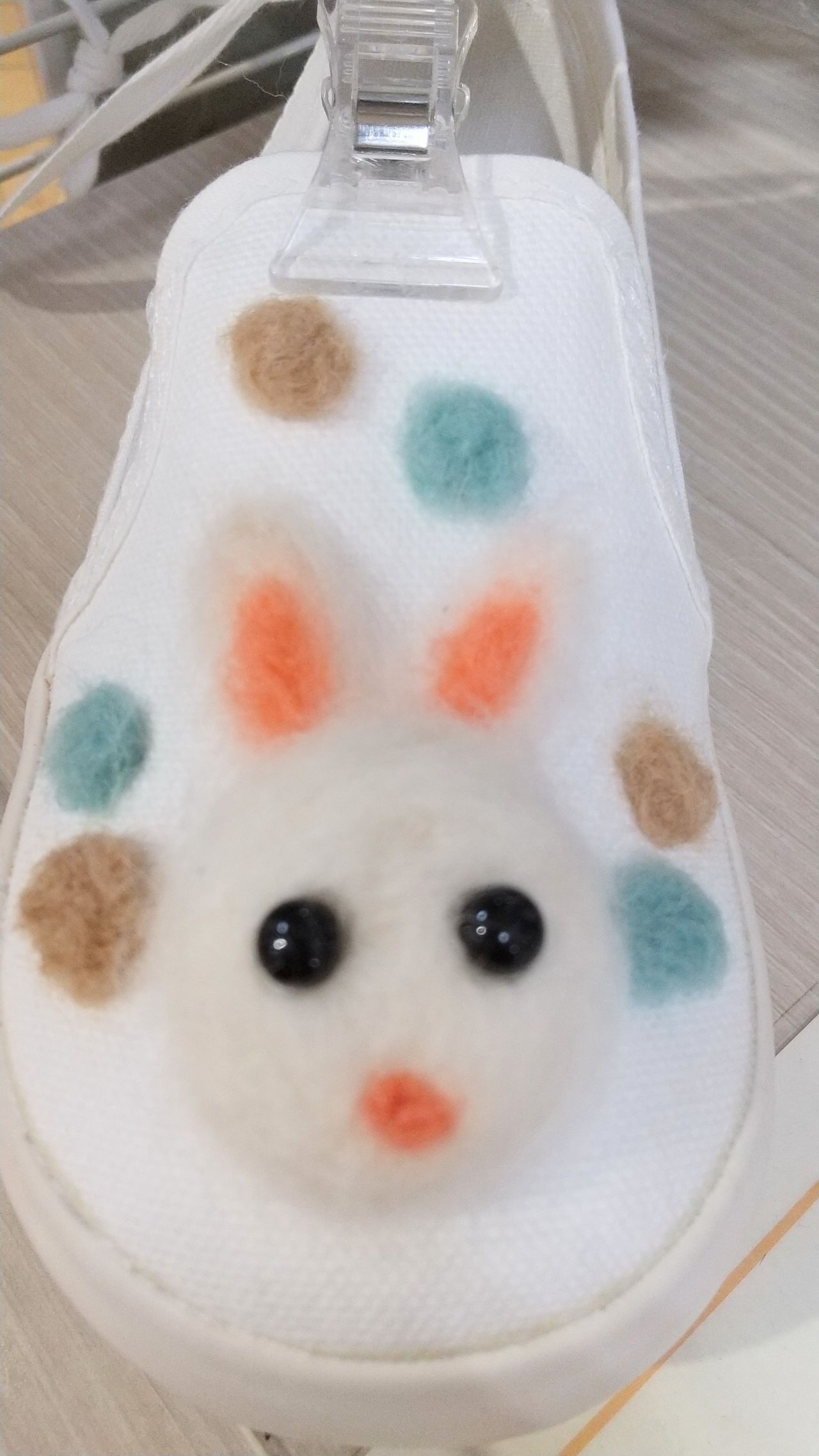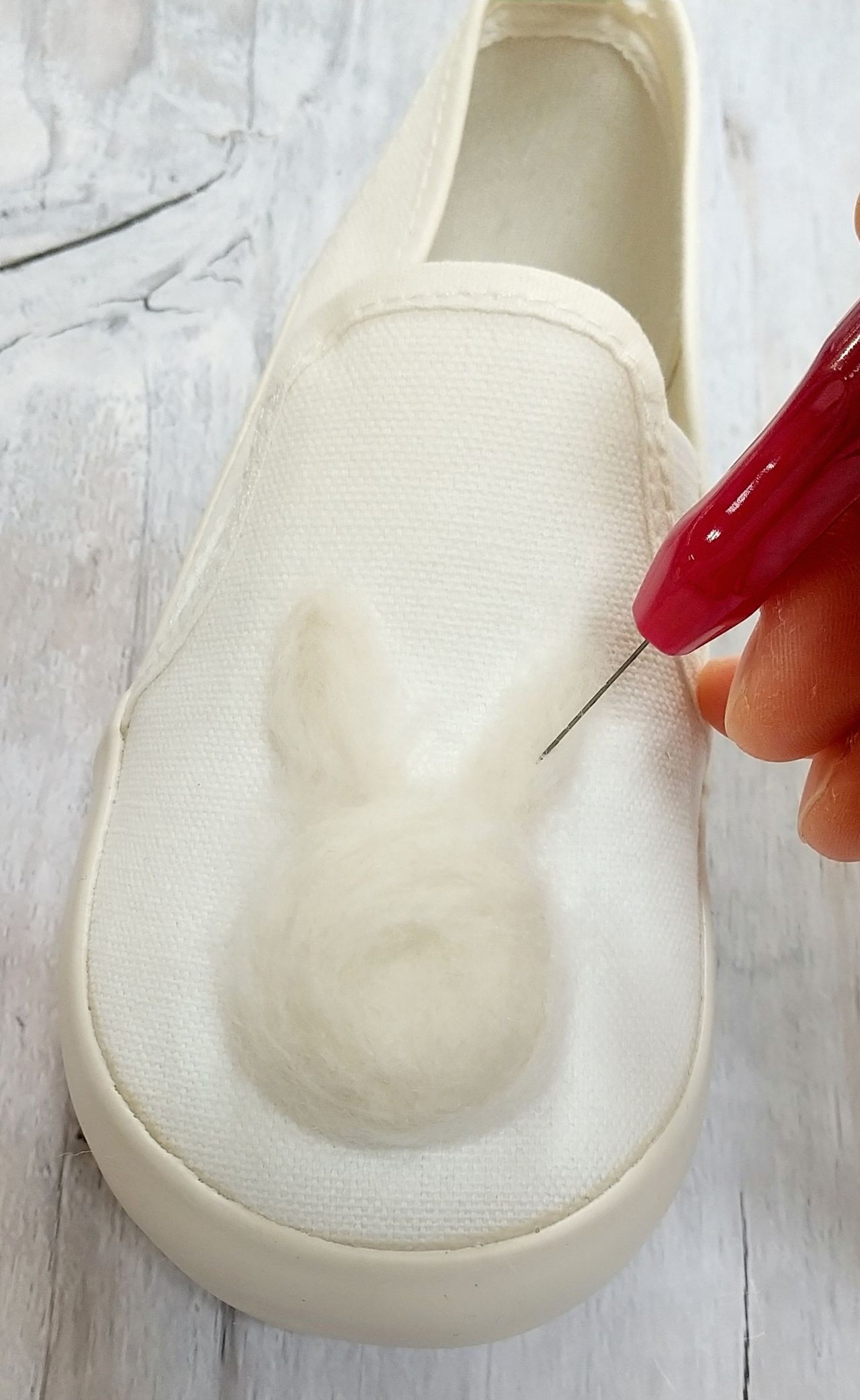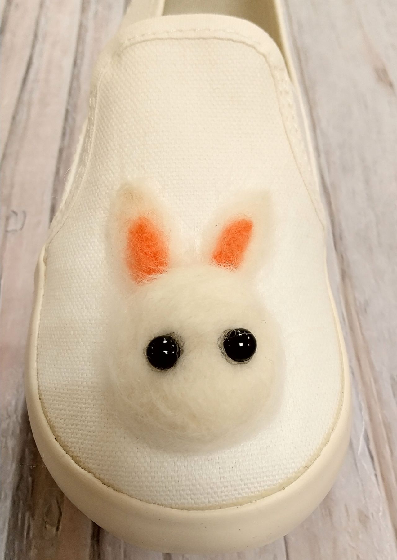 ・白い羊毛フエルトをウサギの耳に見えるよう、細長くしてシューズに刺していく