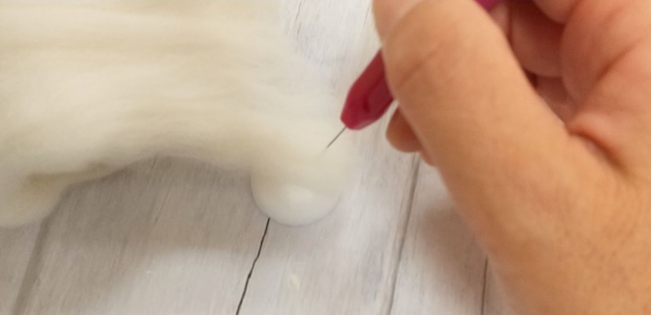 ・半分にしたスチールに白の羊毛フエルトを刺す(指を刺さないように気を付けて下さい!)