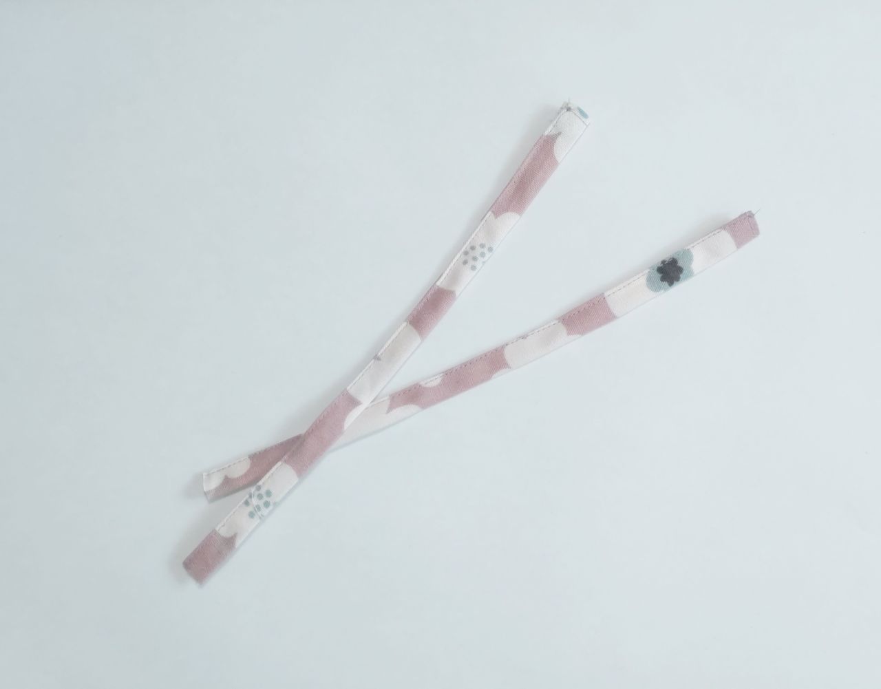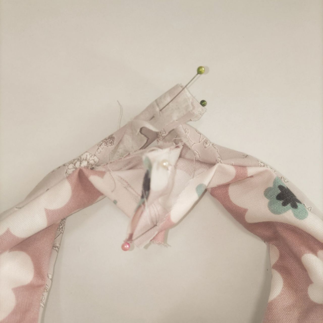 A布またはB布の、入れ口中心にひもを仮止めします。