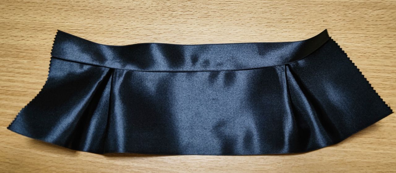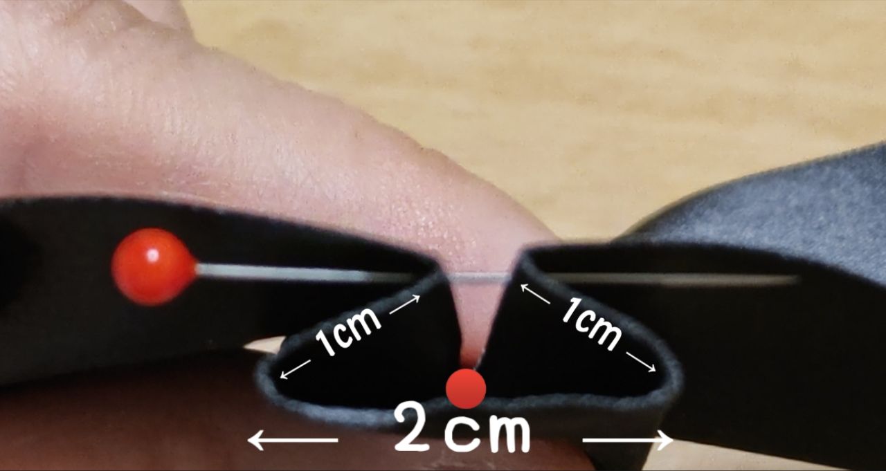 ②印を中心にして画像の長さでタックをつける。1cmで織り込んだ内側と外側両方にボンドをつけて貼る(これを左右作る)