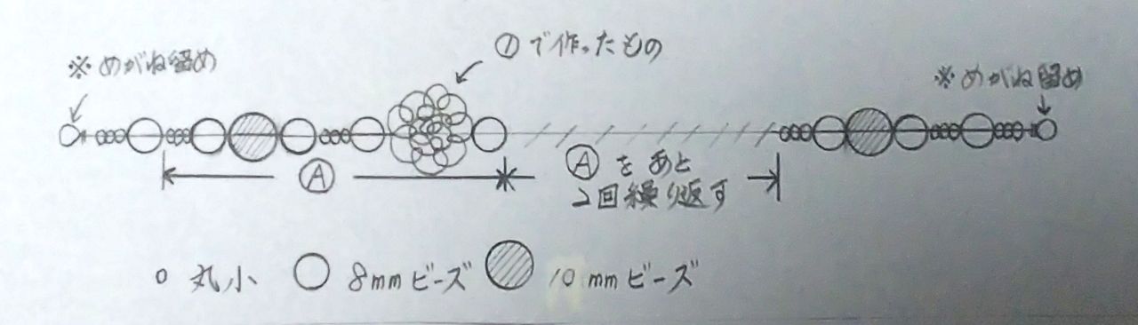 ③ ②にビーズを通して端をめがね留めする。