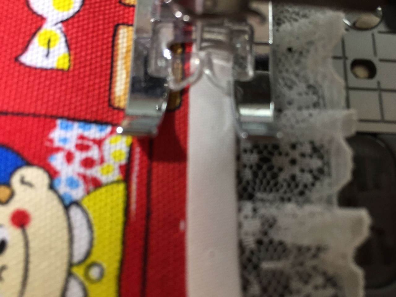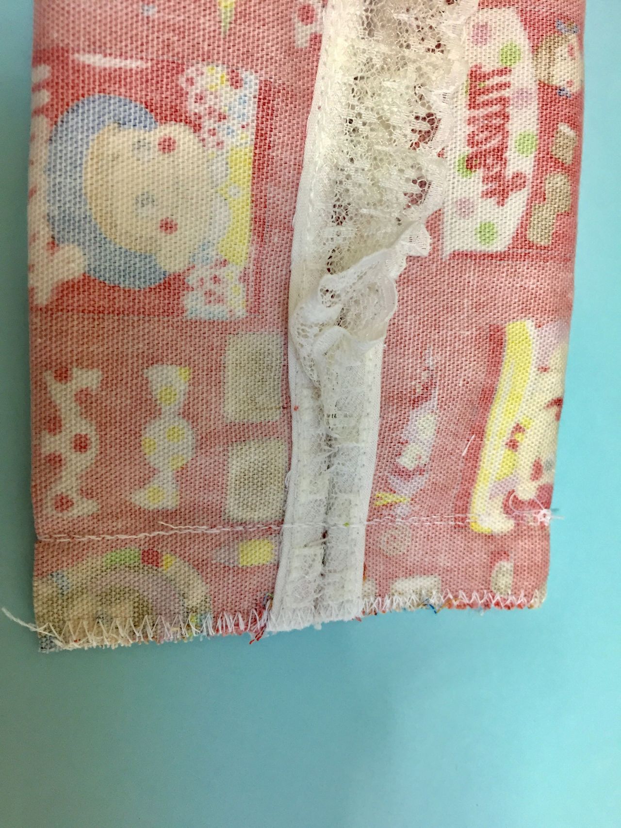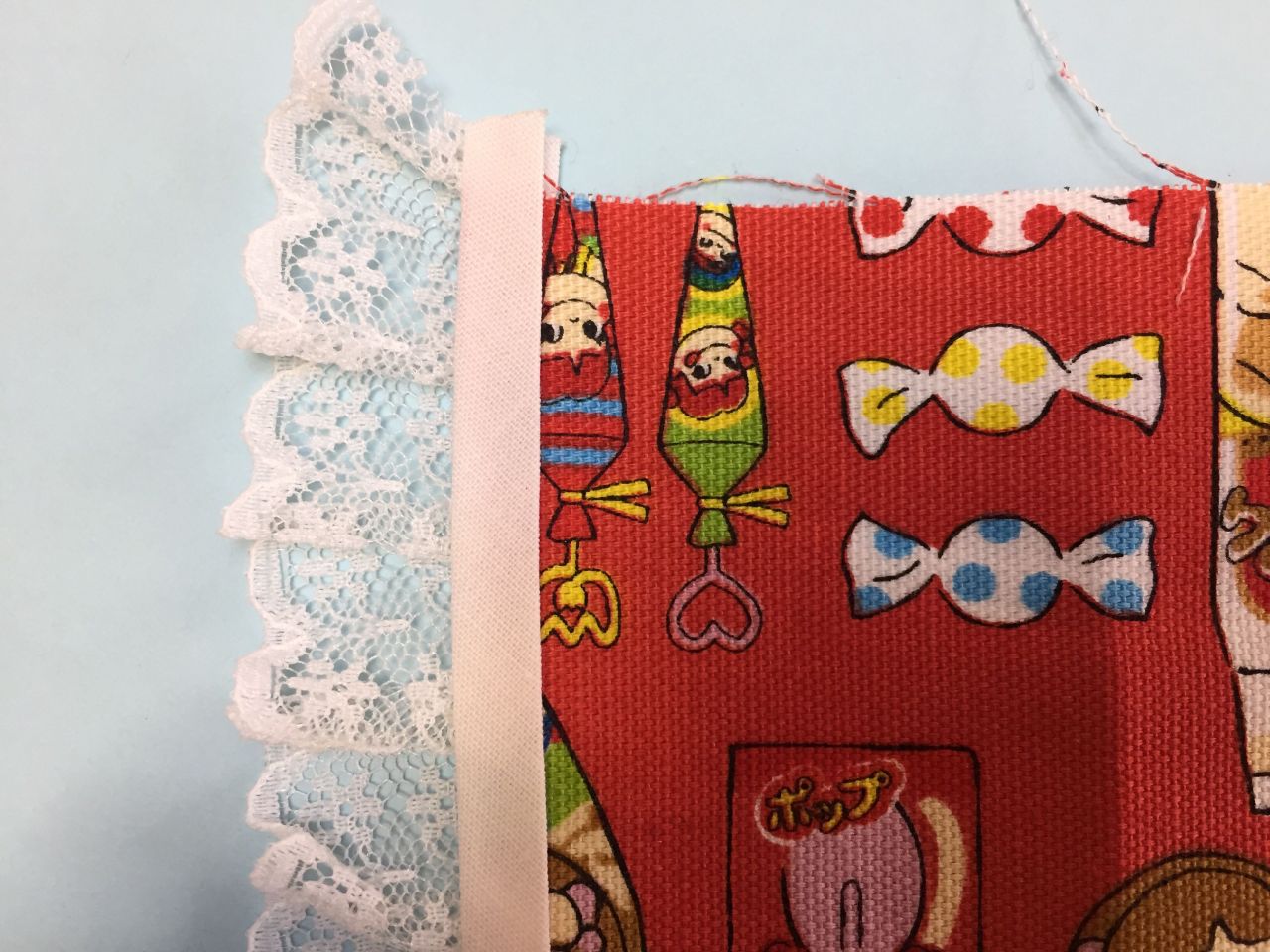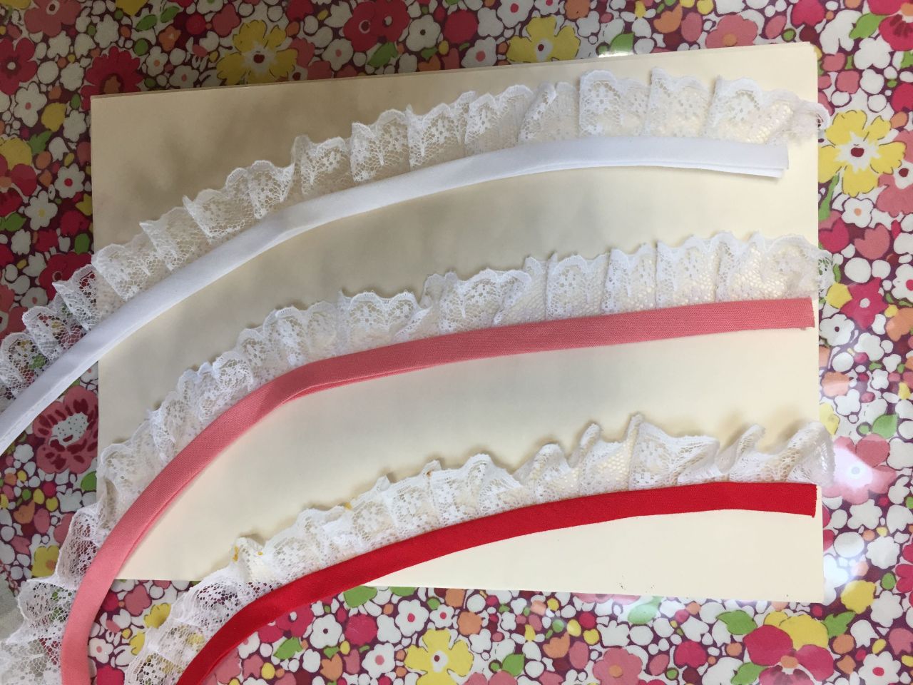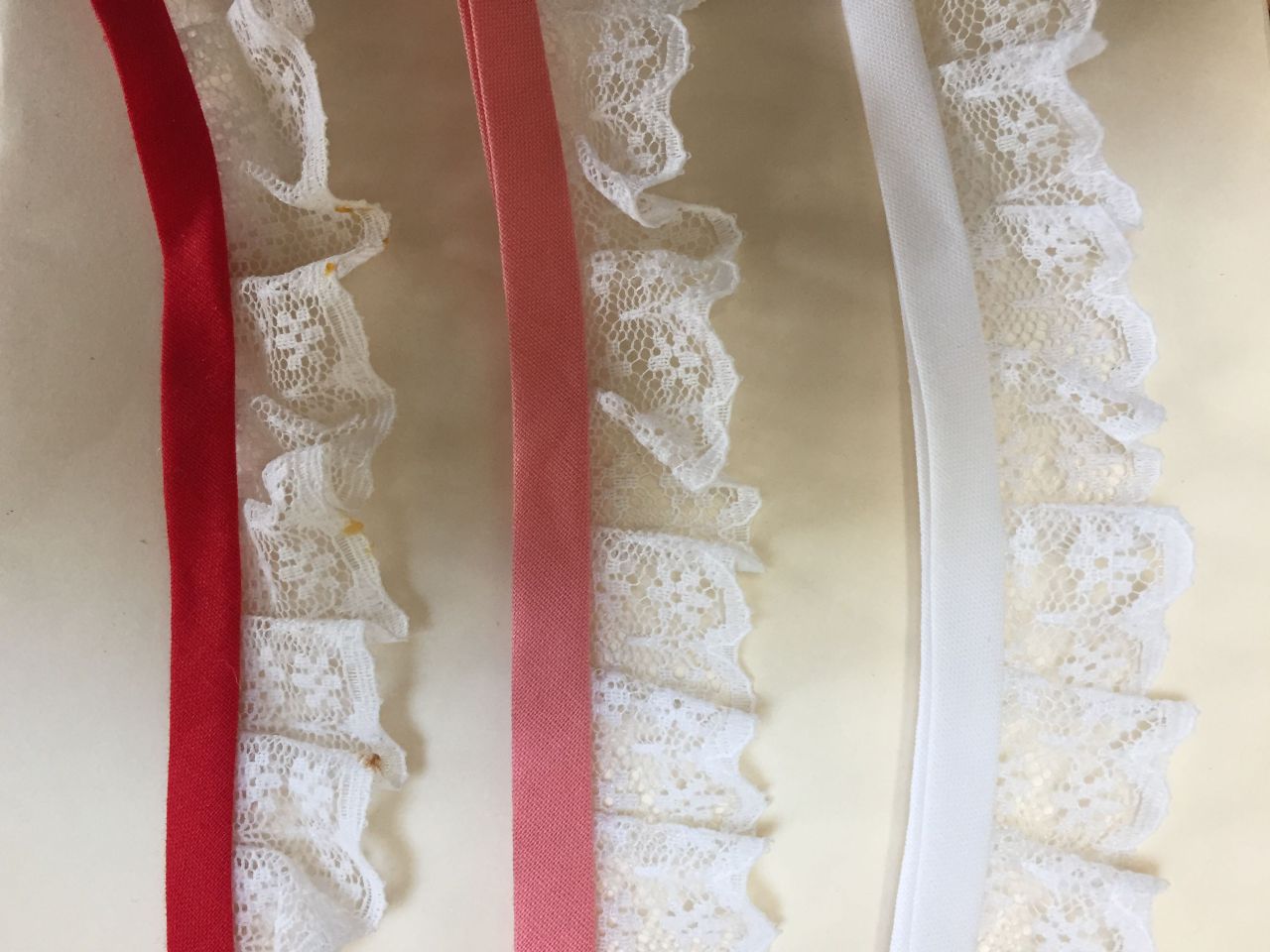 ①18cmX15cmの生地とレース付きバイアステープ14cmを2本用意します。