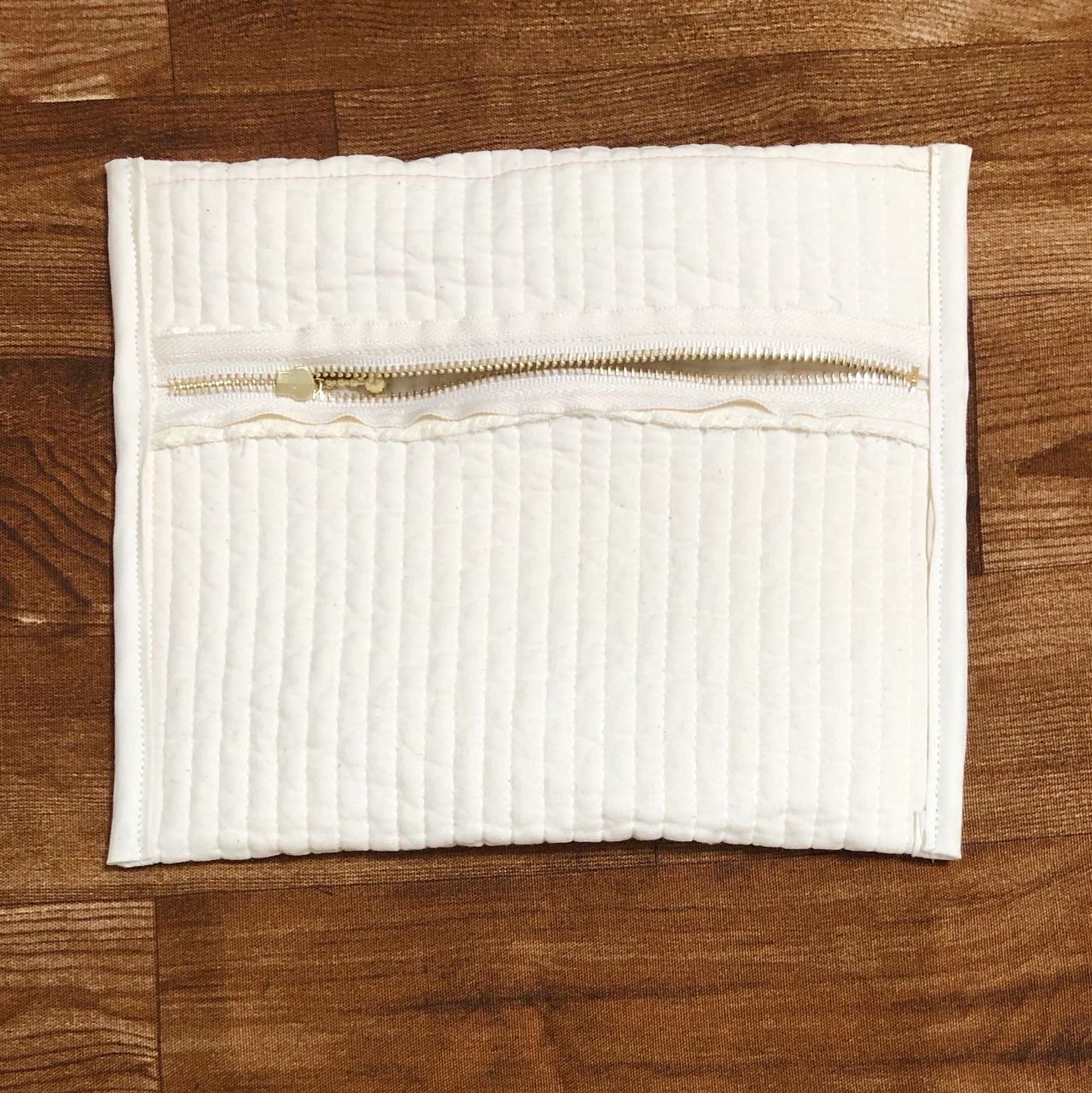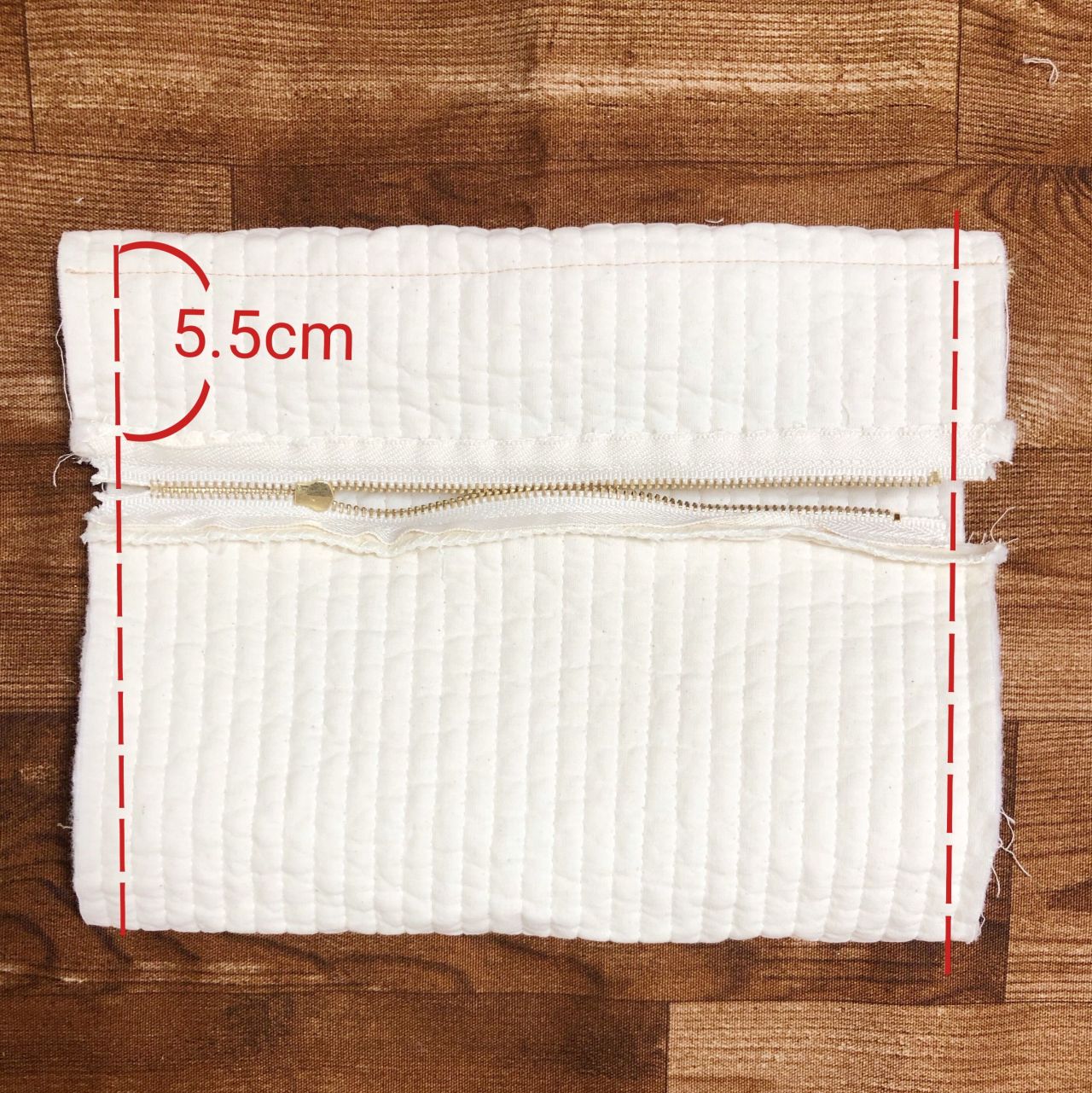 ●下部分の縫い代1cmをアイロンで折り、ぐるっと反対側のファスナーに表から重ねて縫う
