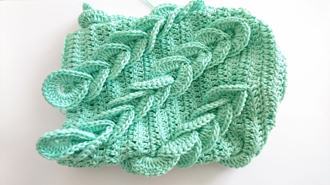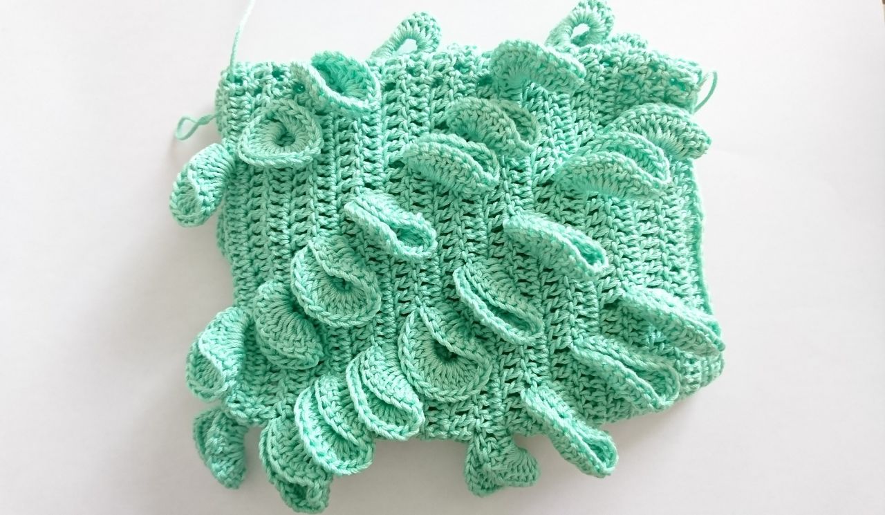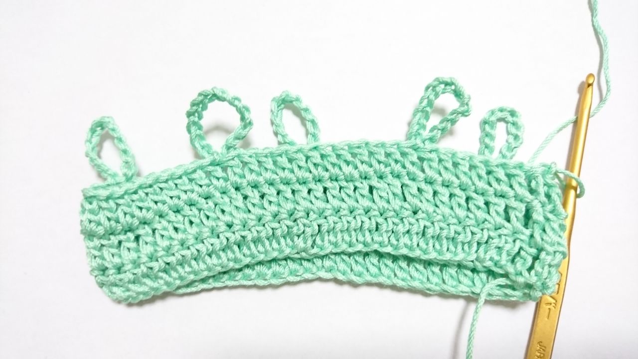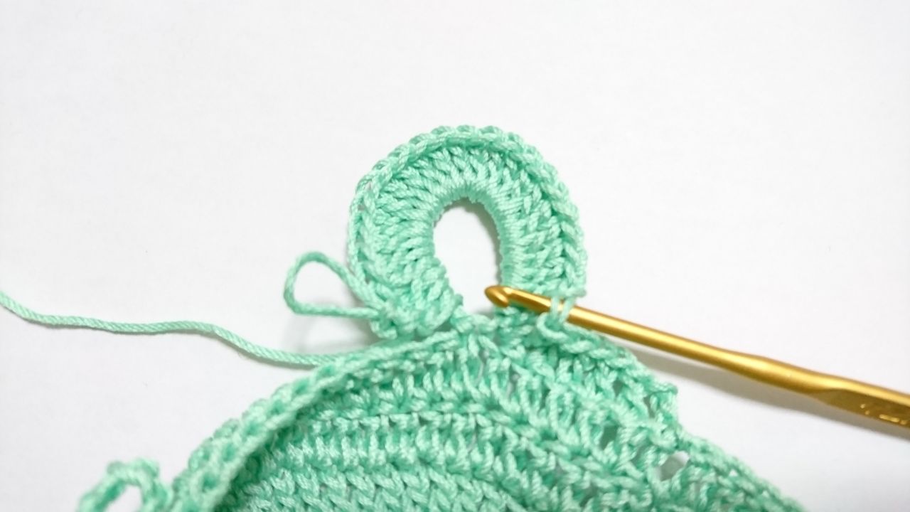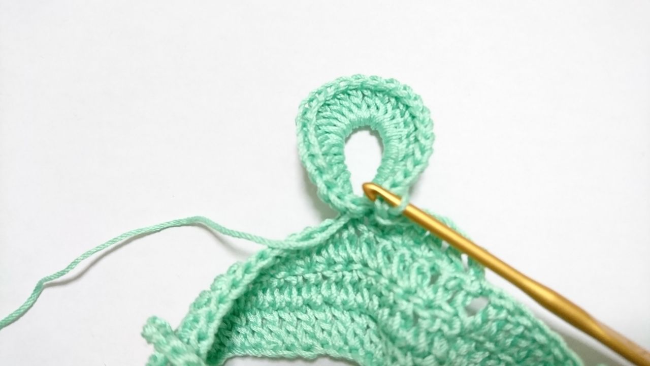 次の戻り段では、輪にした鎖編みに長編みを25目編み入れます