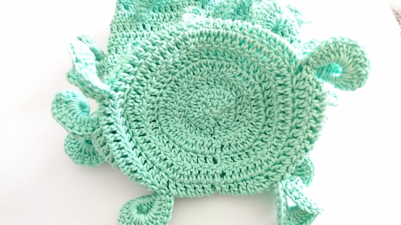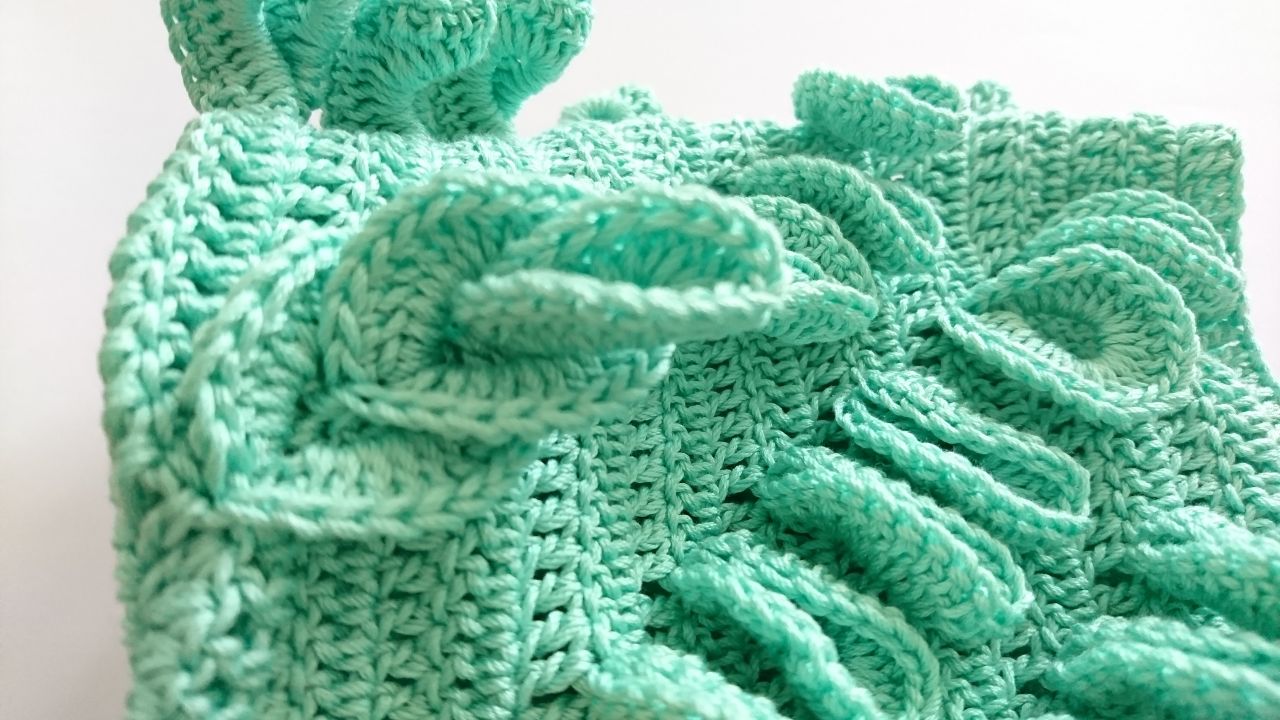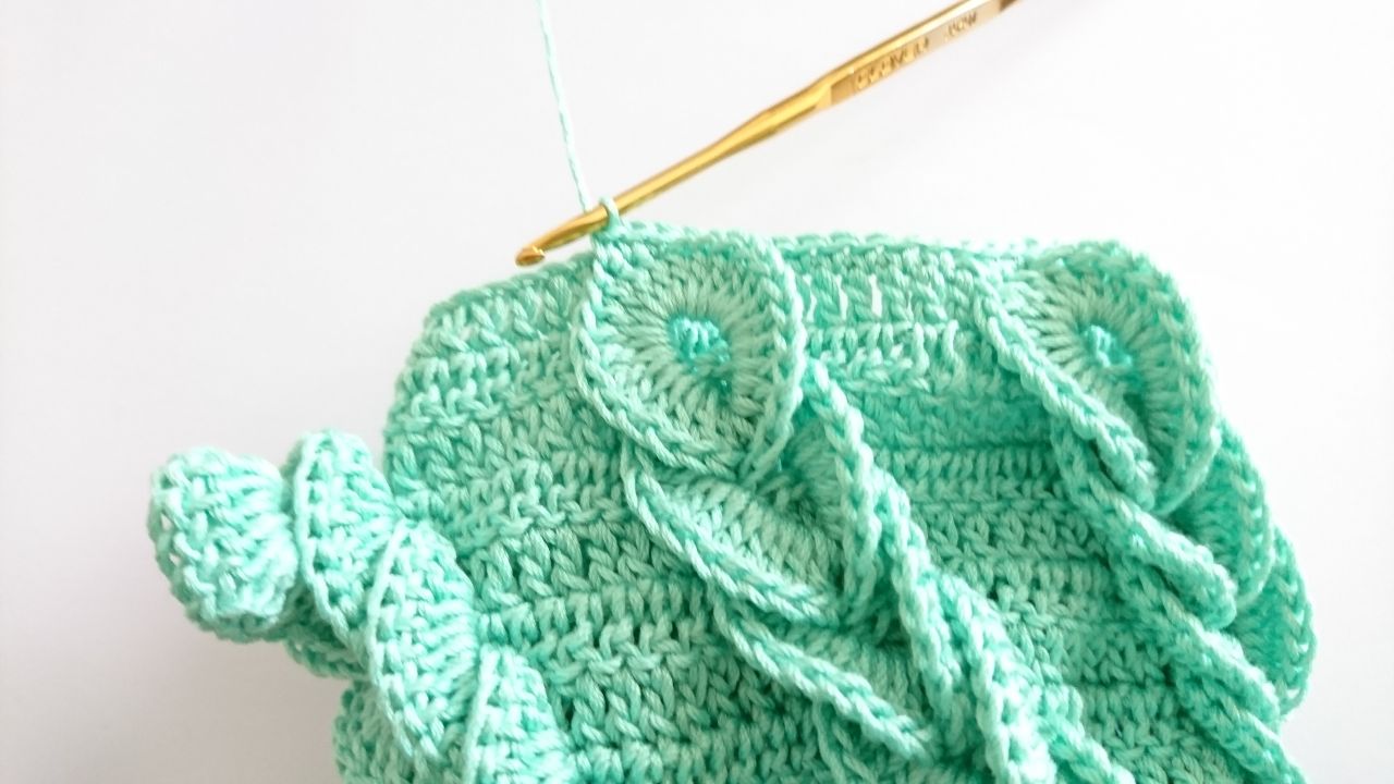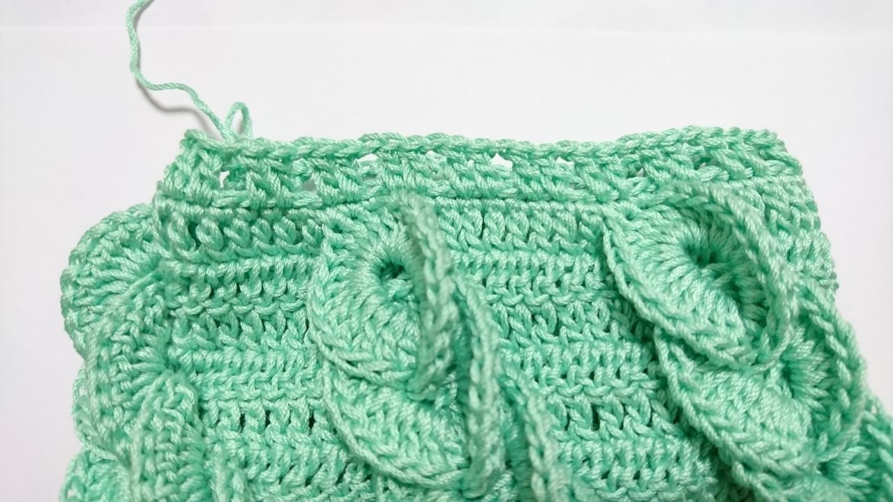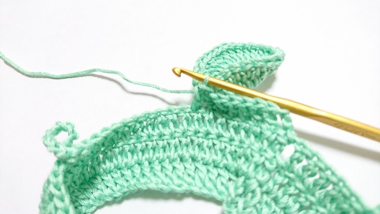 ☆Point 縁編み1段目の細編みを拾うときに4段目ひらひらリングの12、13、14目めも一緒に拾います