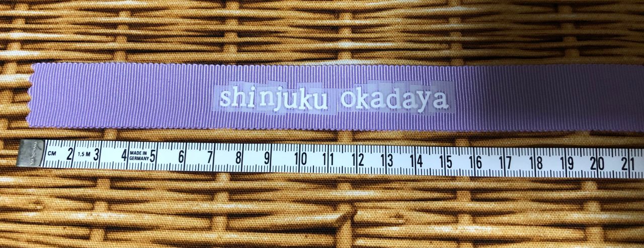 ⚫︎ファブリックステッカーをフィルムごと工作用ハサミで切り取り、リボンの上に文字を並べ、リボンタグの出来上がり寸法を決める