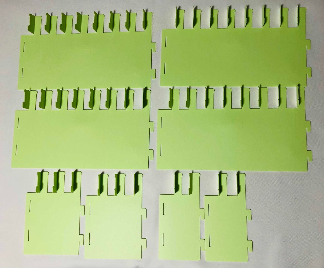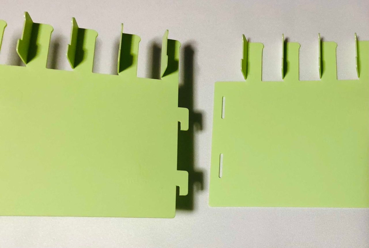 2. 側面のかぎ状の部分を、別パーツの細長い穴に差し込んで、下げると引っかかって止まります。