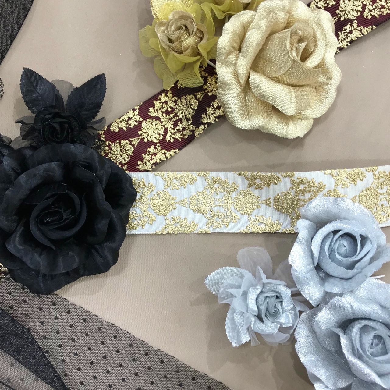 ゴールド、シルバー、ブラックは刺繍リボンやチュールでゴージャスに。