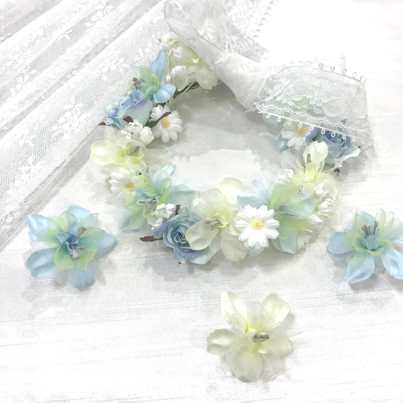 アザレアに姫デージーやクララローズを合わせた花冠。