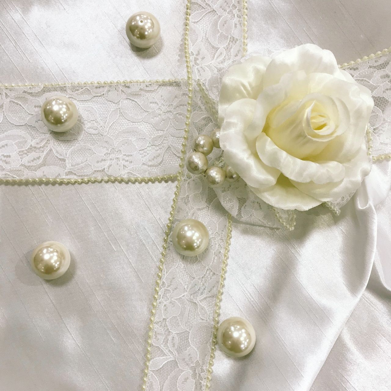 オフホワイトのローズにパールとレースをあしらったコサージュ。