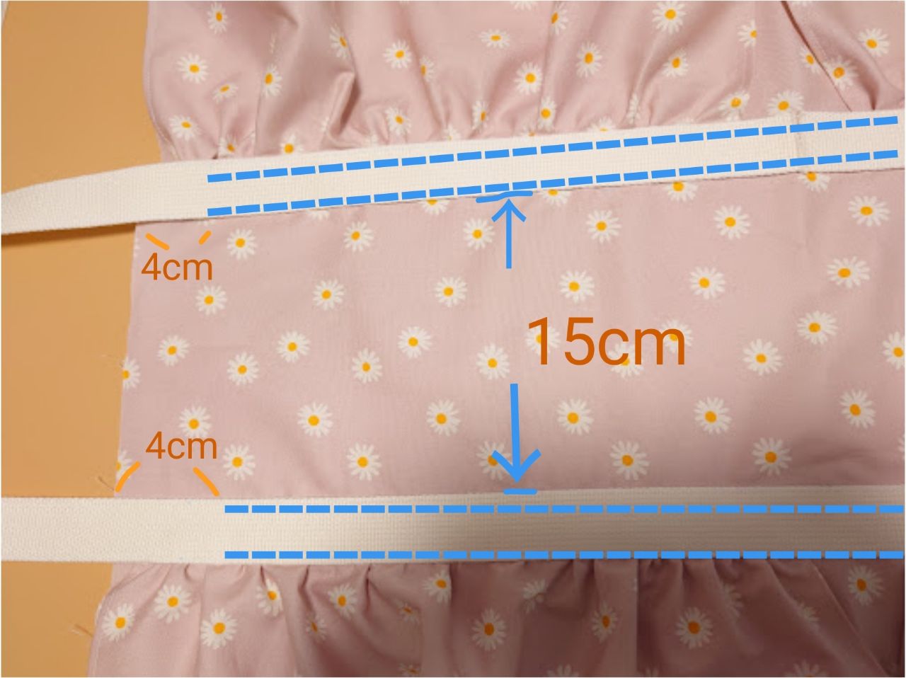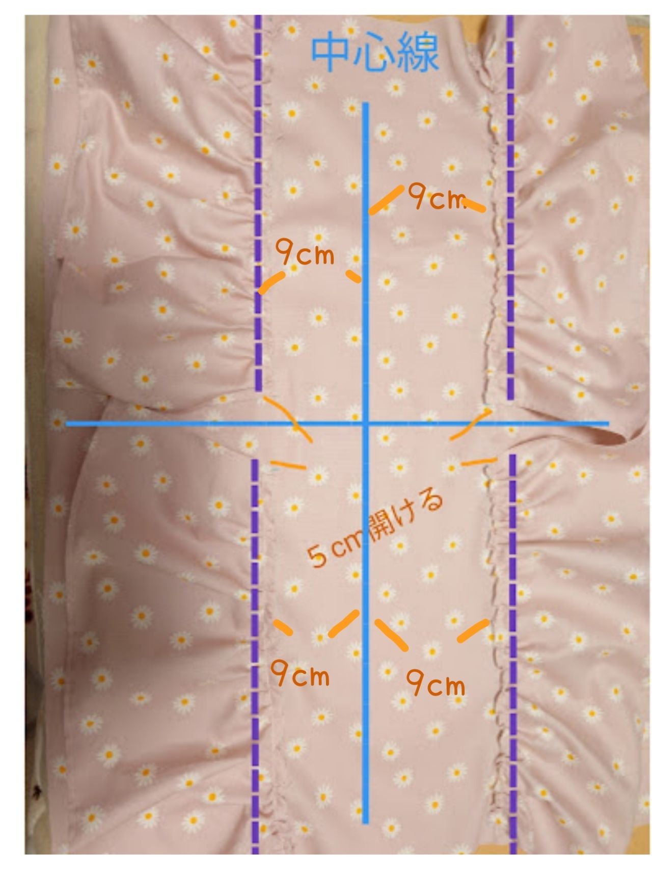 縦中心からそれぞれ9cmの所に2で作ったフリルを配置します。