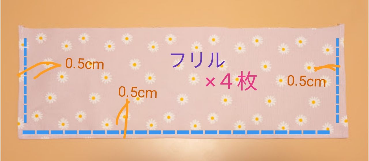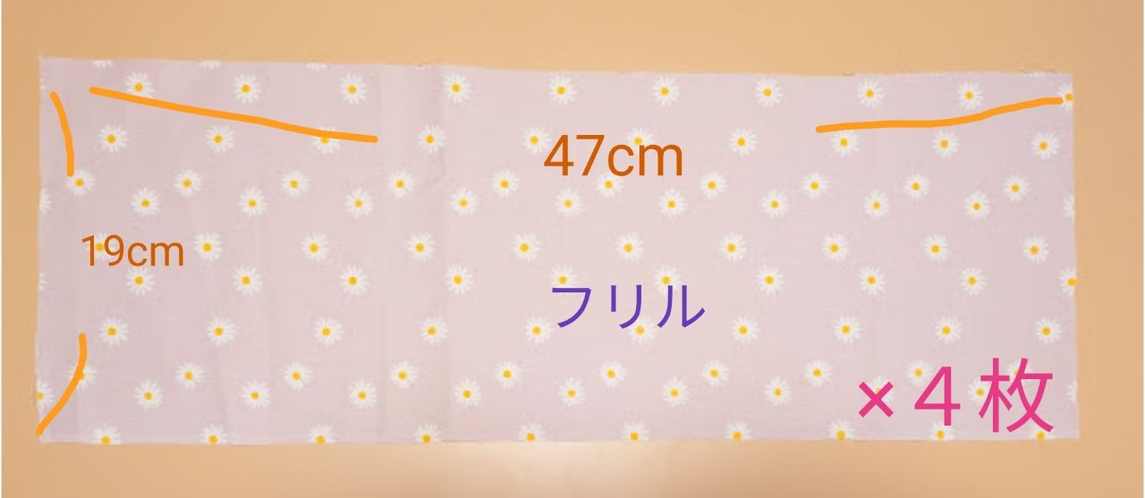 表、裏生地は1枚ずつ、フリルは4枚裁ちます。