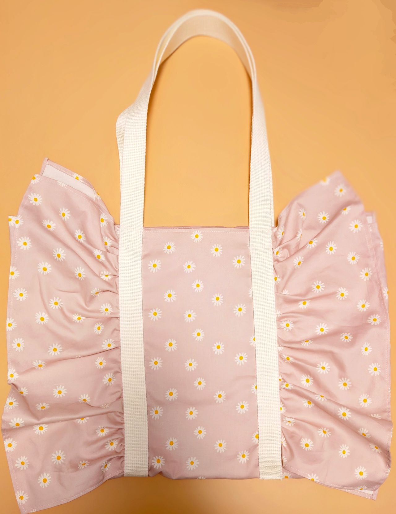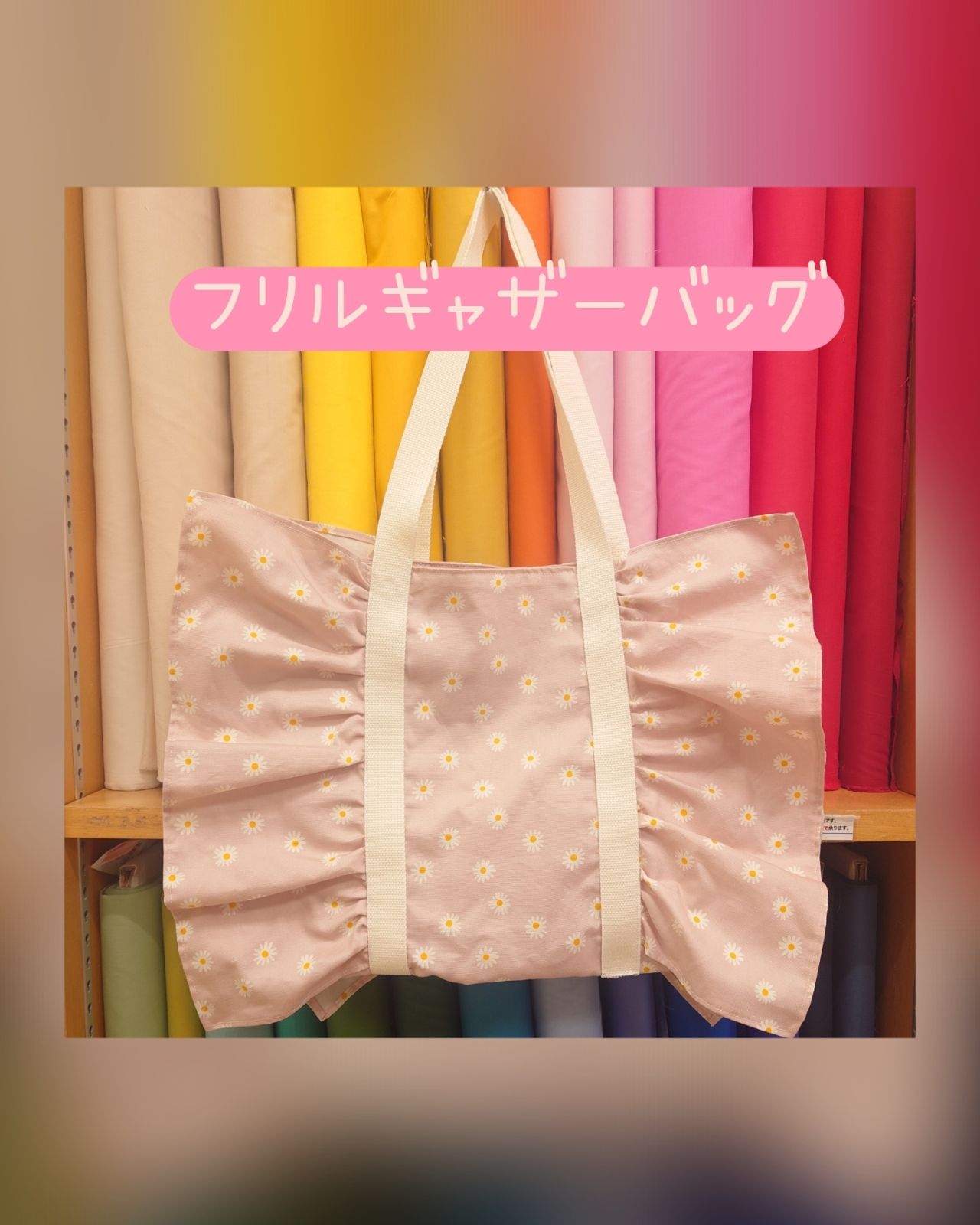 小ぶりなデイジーの柄で、大きいフリルギャザーのついたA4サイズの入るマチ付きバッグを考えてみました。