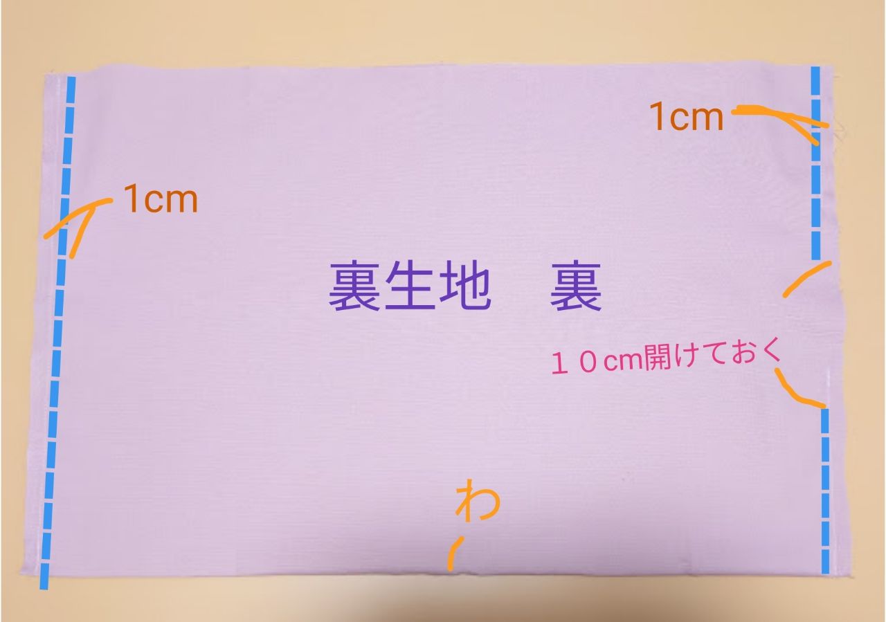⑦裏本体を作ります。底を輪に二つ折りにして、片方は返し口10cm開けておき、縫い代1cmで縫います。縫い代は割ります。